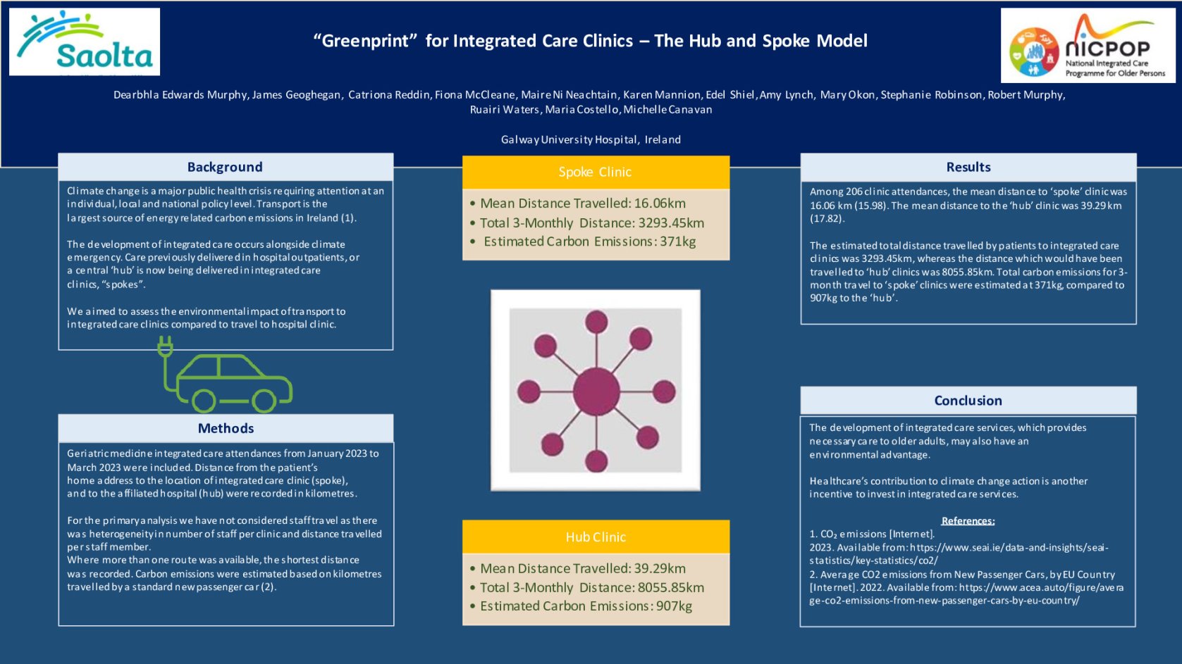 The development of integrated care occurs alongside climate emergency, where transport is a large contributor to carbon emissions (1). Care previously delivered in hospital outpatients, or a central ‘hub’ is now being delivered in integrated care clinics, “spokes”. We aimed to assess the environmental impact of transport to integrated care clinics.