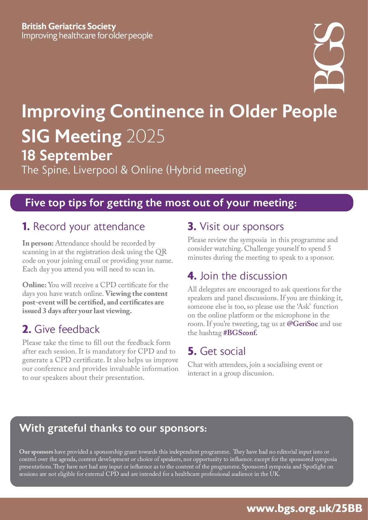 • "A variety of speakers from different fields and backgrounds (Medical, Surgical, NAHPs) covering different aspects of Continence of older people including male and female patients."