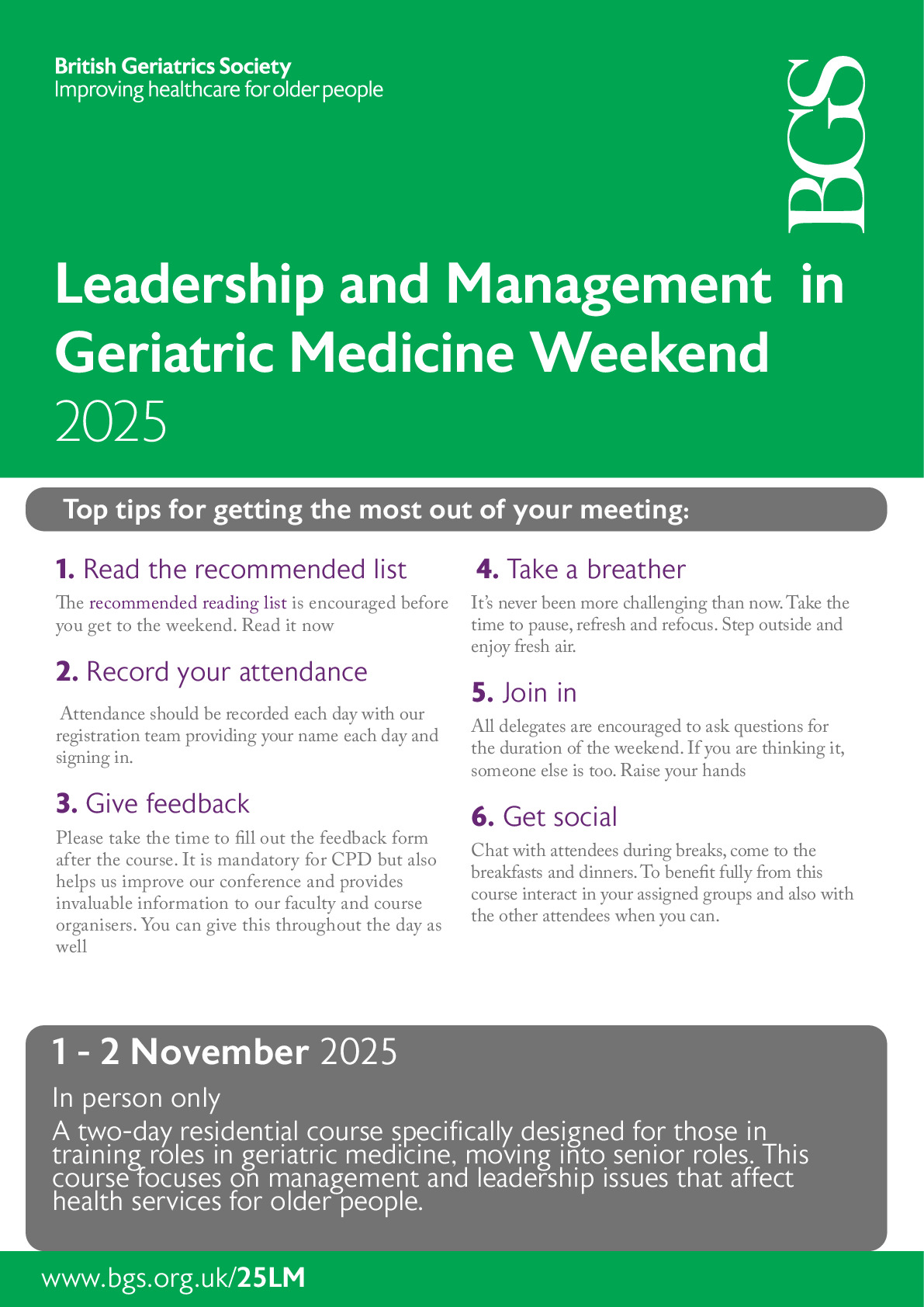 Recommended reading listThe reading list is non-compulsory but it covers some important recent papers that will shape leadership and management agendas for geriatricians over the coming years alongside more generic issues of which you should be aware. The list is not exhaustive and has been whittled down to give a primer ahead of the course. This will be shared with registered attendees for the meeting. If you have any questions about the leadership weekend, please contact registrations@bgs.org.uk Using the seven domains of the NHS Leadership Framework, the course will be structured in small facilitated interactive group sessions, analyzing questions around leadership, policy and management topics that attendees may get asked in consultant interviews. The objective is for each delegate to leave the weekend with a personal development plan for leadership and management for the start of their career as a consultant in geriatric medicine. |