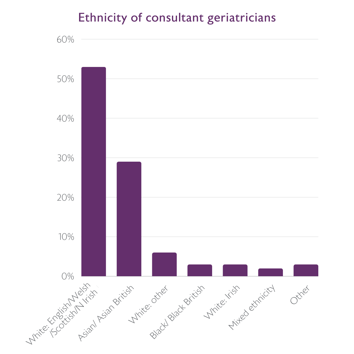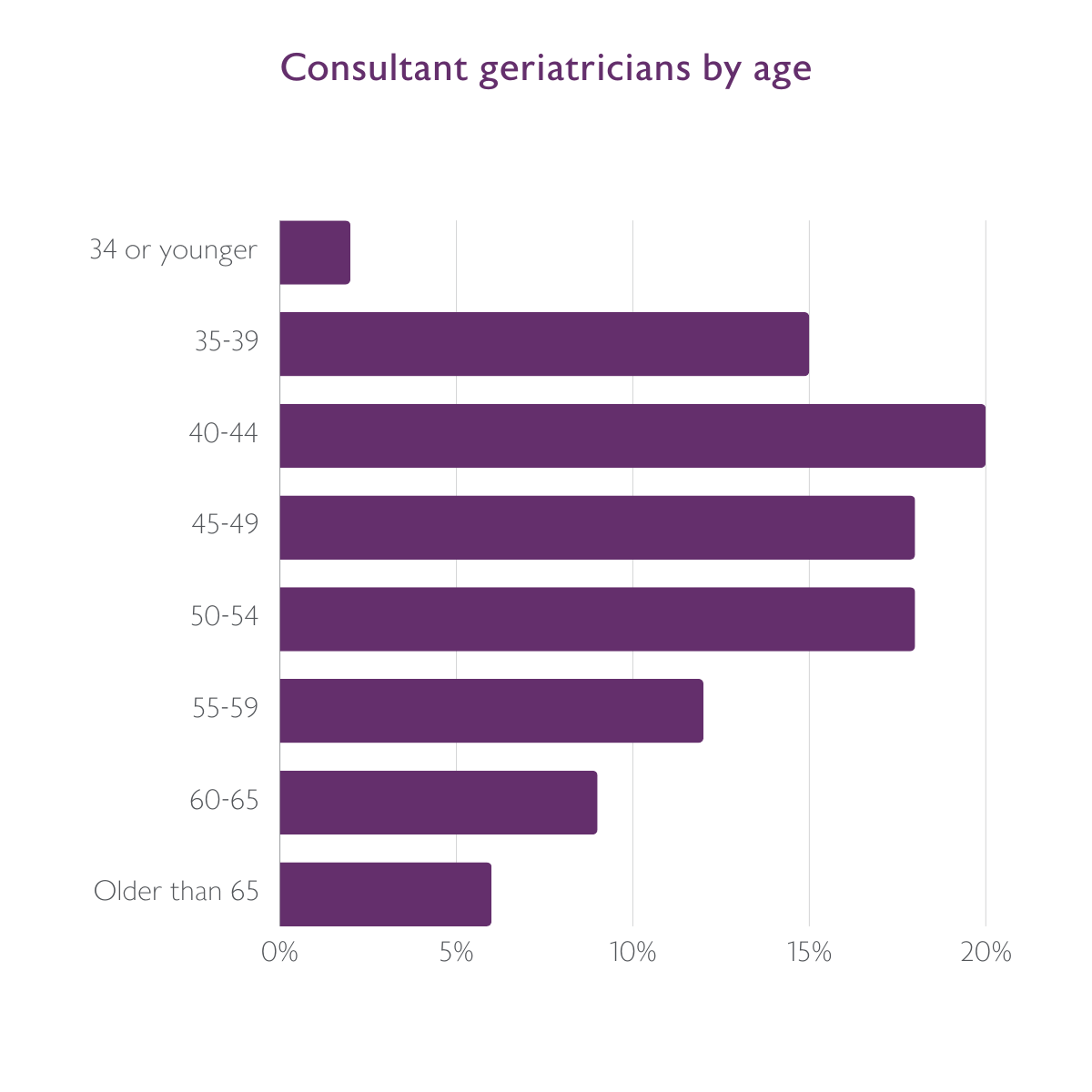This report analyses data from the UK 2022 census of consultant physicians conducted by the Royal College of Physicians (RCP) on behalf of the RCP London, the Royal College of Physicians of Edinburgh (RCPE), and the Royal College of Physicians and Surgeons of Glasgow (RCPSG). The census was published in 2023, using data that was collected in 2022. The BGS would like to express thanks to the RCP who work to conduct this annual census. The data is a valuable resource that allows us to keep track of the current state of the consultant workforce caring for the older population. Of course, consultant geriatricians are just a small part of the multidisciplinary workforce that provide healthcare to older people. The BGS will continue to seek data on the wider workforce in our endeavour to represent the whole multidisciplinary team. Our recent report, The state of the older people’s healthcare workforce: A report from the BGS membership survey, captures some of this evidence from our wider membership but more high level data is needed.1