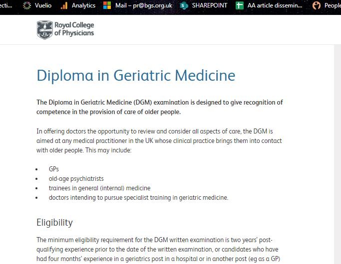 The British Geriatrics Society (BGS) and the Royal College of Physicians of London (RCPL) are aiming to open up the exam to other statutorily regulated healthcare professionals working with older people in hospital, outpatient and community settings. This would include advanced nurse practitioners, physician associates and others who have an interest in working with older people.