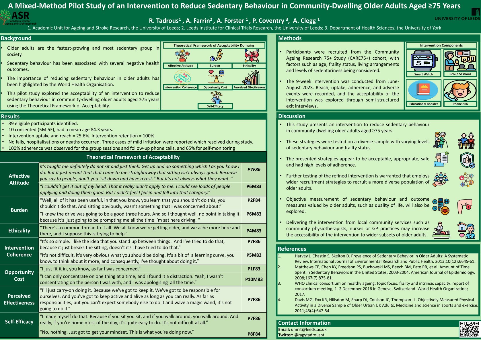 Introduction: Older adults are the fastest growing and most sedentary group in society. With sedentary behaviour associated with negative health outcomes, reducing sedentary time may improve overall wellbeing. This single-arm mixed-method feasibility study explored the acceptability of an intervention to reduce sedentary behaviour in community-dwelling older adults aged ≥75 years.