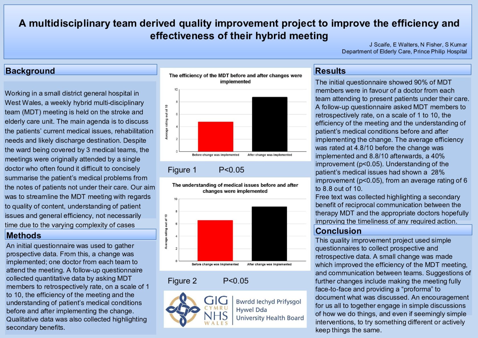 Working in a small district general hospital in Llanelli, West Wales, a weekly hybrid multi-disciplinary team (MDT) meeting is held on the stroke and care of the elderly unit. There are 3 separate geriatric teams covering the ward. Typically, these meetings are attended by physiotherapists, occupational therapists, speech and language therapists, discharge nurses, social workers, nurses and a doctor. The main agenda is to discuss the patients’ current medical issues, rehabilitation needs and likely discharge destination/complexities. Medically, these meetings were attended by a single doctor who often found it difficult to concisely summarise the patient’s medical problems from the notes of patients not under their care. Our aim was to streamline the MDT meeting with regards to quality of content, understanding of patient issues and general efficiency. An initial questionnaire was used to gather prospective data. 90% of MDT members suggested that a doctor from each team should attend to present patients under their care and engage in onward discussions. This was implemented over the period of a month. A follow-up questionnaire collected quantitative data by asking MDT members to retrospectively rate, on a scale of 1 to 10, the efficiency of the meeting and the understanding of patient’s medical conditions before and after implementing the change. The average efficiency was rated at 4.8/10 before the change was implemented and 8.8/10 afterwards, a 40% improvement. Understanding of patient medical issues had a 28% improvement, from an average rating of 6 to 8.8. Qualitative and free text data was also collected highlighting a secondary benefit of reciprocal communication between the therapy MDT and the appropriate medical doctors hopefully improving the timeliness of any required action. Suggestions of further changes include making the meeting fully face-to-face, providing a “proforma” to document what was discussed and introducing other members of community teams.