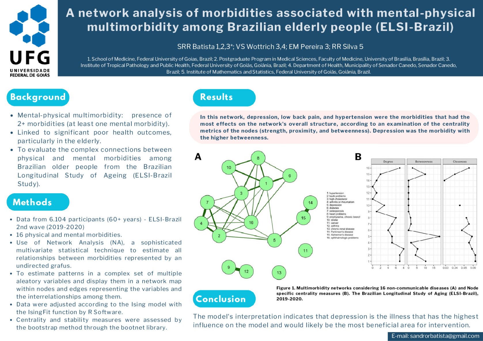 The coexistence of two or more morbidities, including at least one mental morbidity, is defined as mental-physical multimorbidity (MP-MM). It is linked to significant poor outcomes, such as a high burden of healthcare utilisation, particularly in the elderly. To evaluate the complex connections between the 16 physical and mental morbidities among Brazilian older people from the Brazilian Longitudinal Study of Ageing, we performed a network analysis (NA), a sophisticated multivariate statistical technique to estimate all relationships between morbidities represented by an undirected grafus. The objective was to estimate patterns in a complex set of multiple aleatory variables and display them in a network map within nodes and edges representing the variables and the interrelationships among them. In this study, we applied the NA to model interrelationships among chronic physical morbidities and depression. We utilised data from 6.104 participants of the second wave (2019-2020) of the Brazilian Longitudinal Study of Ageing (ELSI-Brazil). The data were adjusted according to the Ising model with the IsingFit function by R Software. Centrality and stability measures were assessed by the bootstrap method through the bootnet library. In this network, depression, low back pain, and hypertension were the morbidities that had the most effects on the network's overall structure, according to an examination of the centrality metrics of the nodes (strength, proximity, and betweenness). Depression was the morbidity with the higher betweenness. The model's interpretation indicates that depression is the illness that has the highest influence on the model and would likely be the most beneficial area for intervention.
