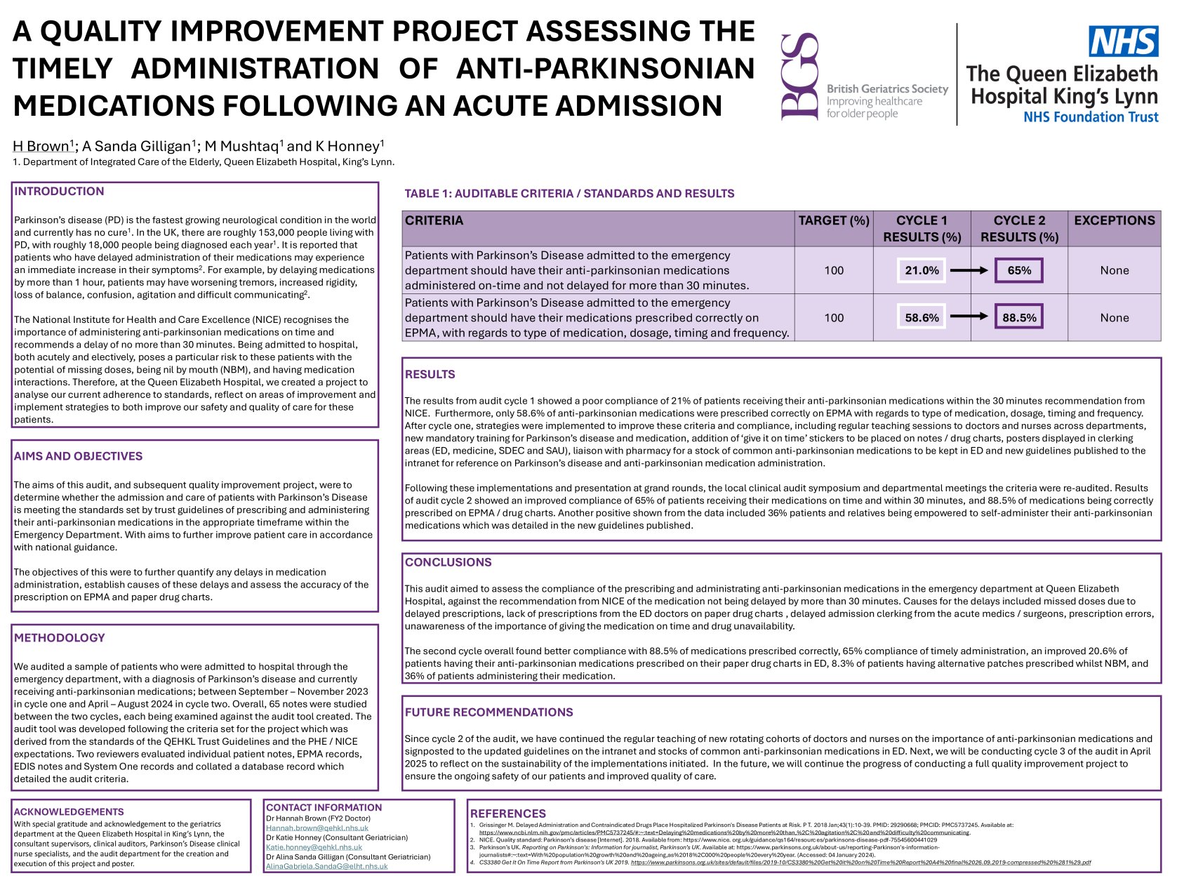 This quality improvement project (QIP) aimed to determine whether the acute admission of patients with Parkinson’s Disease (PD) is meeting the current NICE guidelines in the appropriate prescription and timely administration of anti-parkinsonian medications (APM). The project evaluated the accuracy of prescriptions, quantified delays in medication administration, and established the causative factors for delays.