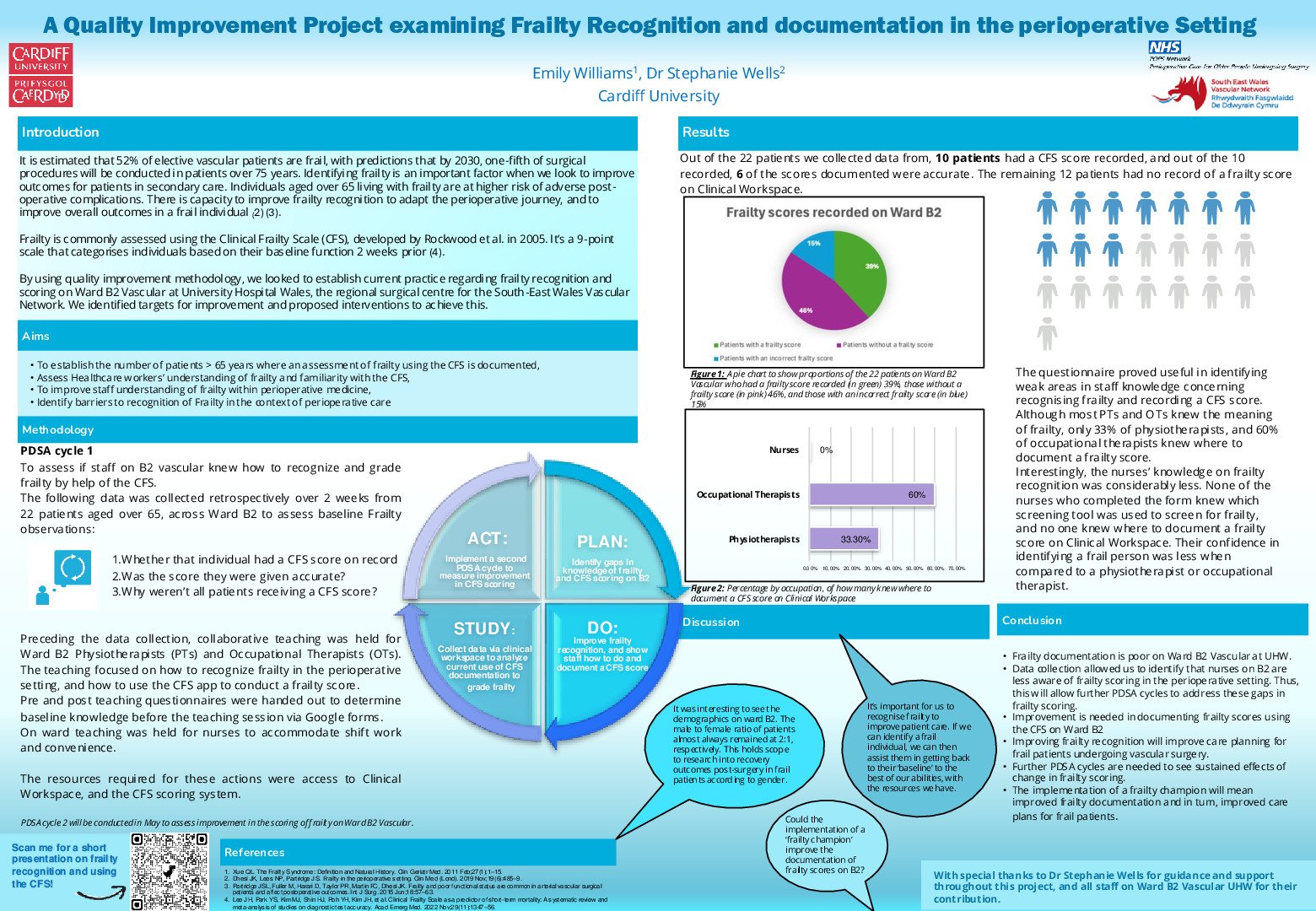 Conclusions: Identifying frailty enables better perioperative risk assessment and surgical decision-making. Frailty documentation on Ward B2 is inadequate. Data collection highlighted nurses' lower awareness of frailty scoring, necessitating further improvement cycles. 73% of patients were frail, with 36% not previously identified as such. Improving frailty recognition will enhance care planning for frail patients undergoing vascular surgery. Designating a 'Frailty Champion' could improve frailty score documentation and ensure its routine inclusion in assessments on Ward B2 at UHW.
