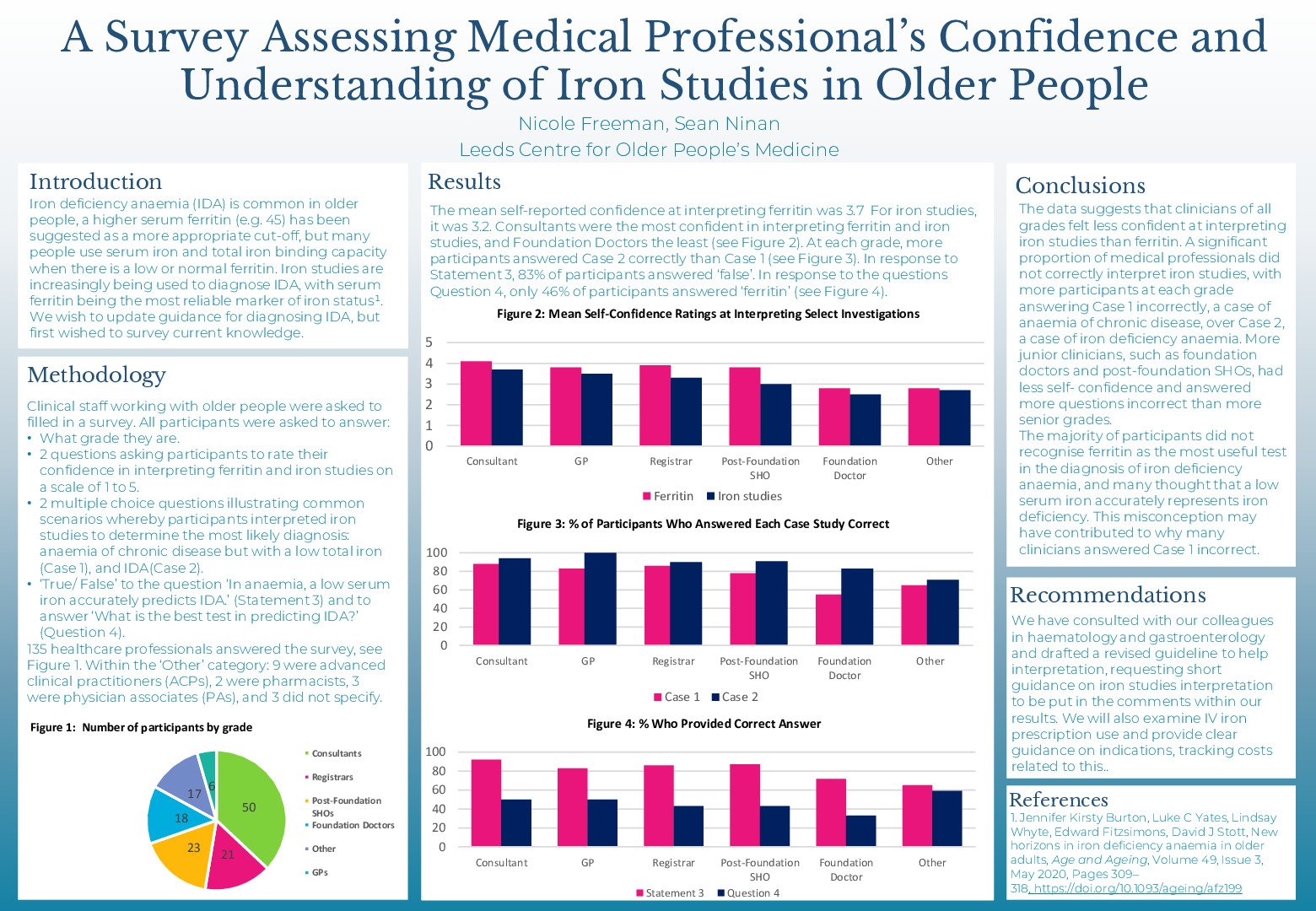 Clinical staff working with older people were asked to filled in a survey. They answered questions relating to confidence in interpreting ferritin and iron studies. Their knowledge of interpreting iron studies was assessed with two multiple choice questions illustrating common scenarios.