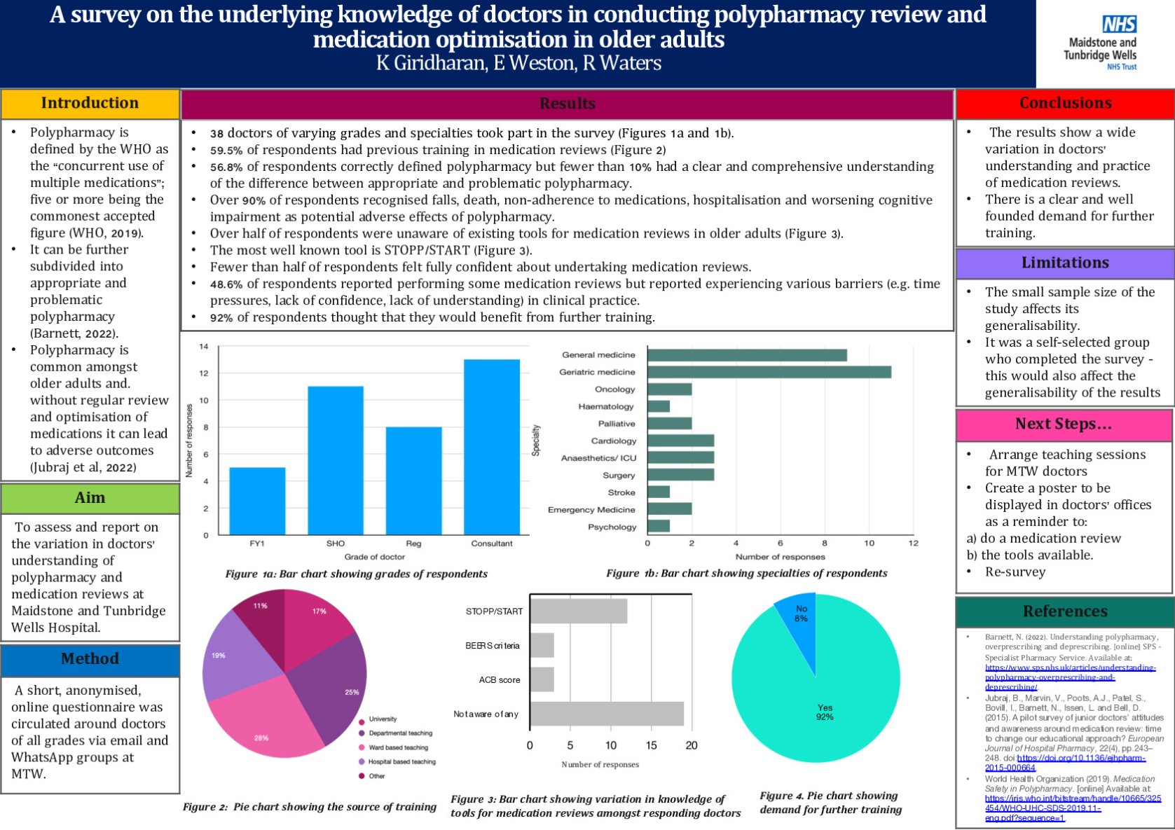 Polypharmacy is common amongst older adults and could result in adverse outcomes if not reviewed and optimised regularly (Davies et al, 2020). The aim of this survey is to assess and report on the variation in doctors’ understanding of medication reviews at Maidstone and Tunbridge Wells hospitals (MTW).