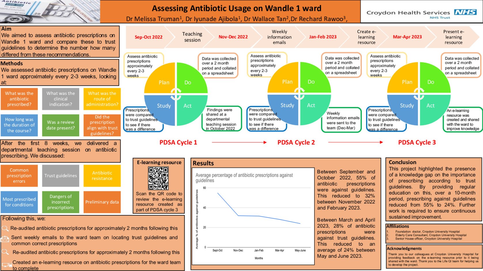 The World Health Organisation lists antibiotic resistance as one of the biggest threats to global health [1]. We contribute to this as clinicians, through errors such as delayed review of prescriptions or prescribing against local trust guidelines. We have carried out a quality improvement project to improve antibiotic prescriptions on a geriatric ward at Croydon University Hospital. We carried out a fortnightly cross-sectional analysis of the antibiotic prescriptions on a geriatric ward. This included looking at the antibiotic prescribed, indication, duration, route of administration and presence of a review date. These were then compared to trust guidelines. After the first 8-weeks, we delivered a departmental teaching session on antibiotic prescriptions. We then re-audited the prescriptions. Following this, we sent out weekly email reminders on locating trust guidelines and information on prescriptions. We then re-audited following this. Finally, we created an e-learning resource to deliver to the ward on antibiotic prescriptions. We are planning to deliver this to the ward and re-audit afterwards. Initially, up to 90.0% of prescriptions differed from trust guidelines. Common reasons for differences when compared included incorrect drug prescribed, incorrect frequency of dosing, or non-specific indications leading to difficulty comparing. Following all interventions, approximately 32% of prescriptions differed from trust guidelines. This showed sustained improvement across 2 complete PDSA cycles (plan,do,study,act). A 3rd PDSA cycle is ongoing at present and preliminary data has shown approximately 28% of prescriptions differed from trust guidelines. This quality improvement project has successfully contributed to a reduction in prescription errors and safe prescribing. We will continue to provide information to our colleagues on antibiotic stewardship, to further encourage safe prescribing. [1]. Antibiotic resistance (2020) World Health Organization. Available at: https://www.who.int/news-room/fact-sheets/detail/antibiotic-resistance (Accessed: May 2023).