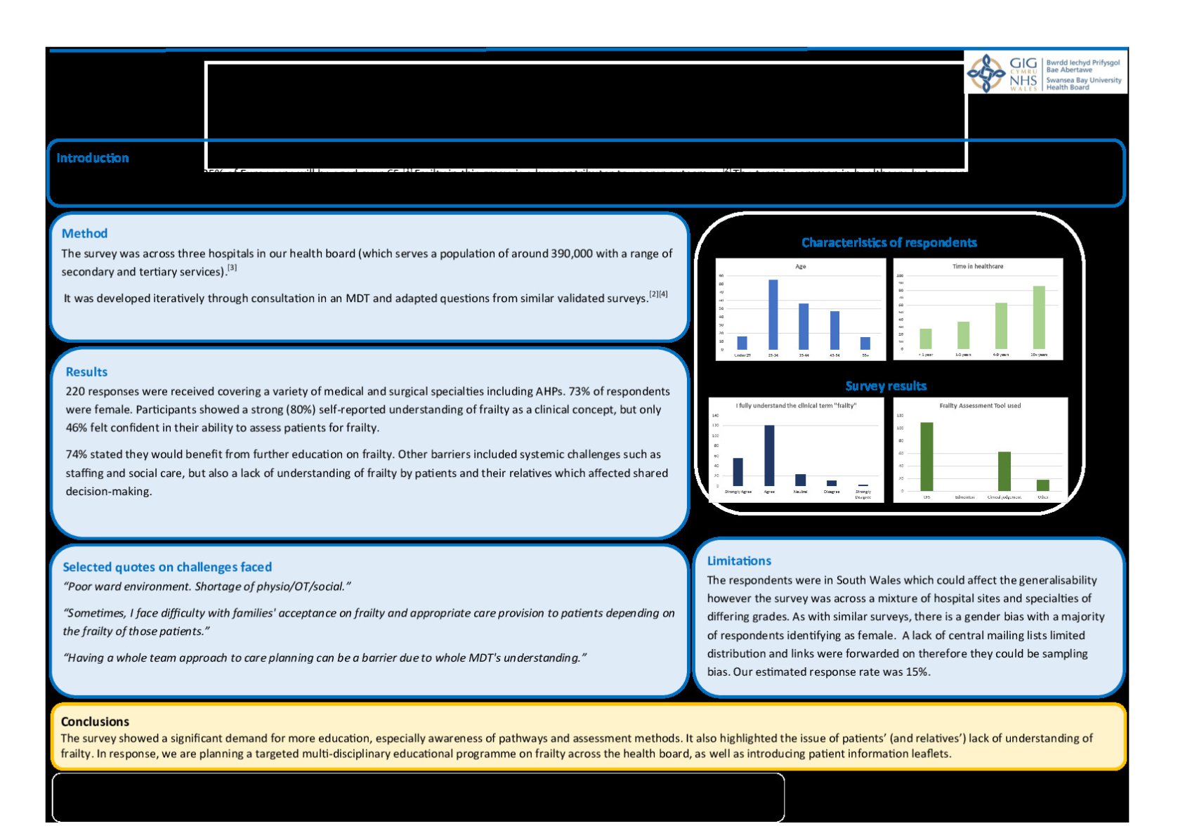 The survey showed a significant demand for more education, especially awareness of pathways and assessment methods. It also highlighted the issue of patients’ (and relatives’) lack of understanding of frailty. In response, we are planning a targeted multi-disciplinary educational programme on frailty across the health board, as well as introducing patient information leaflets.