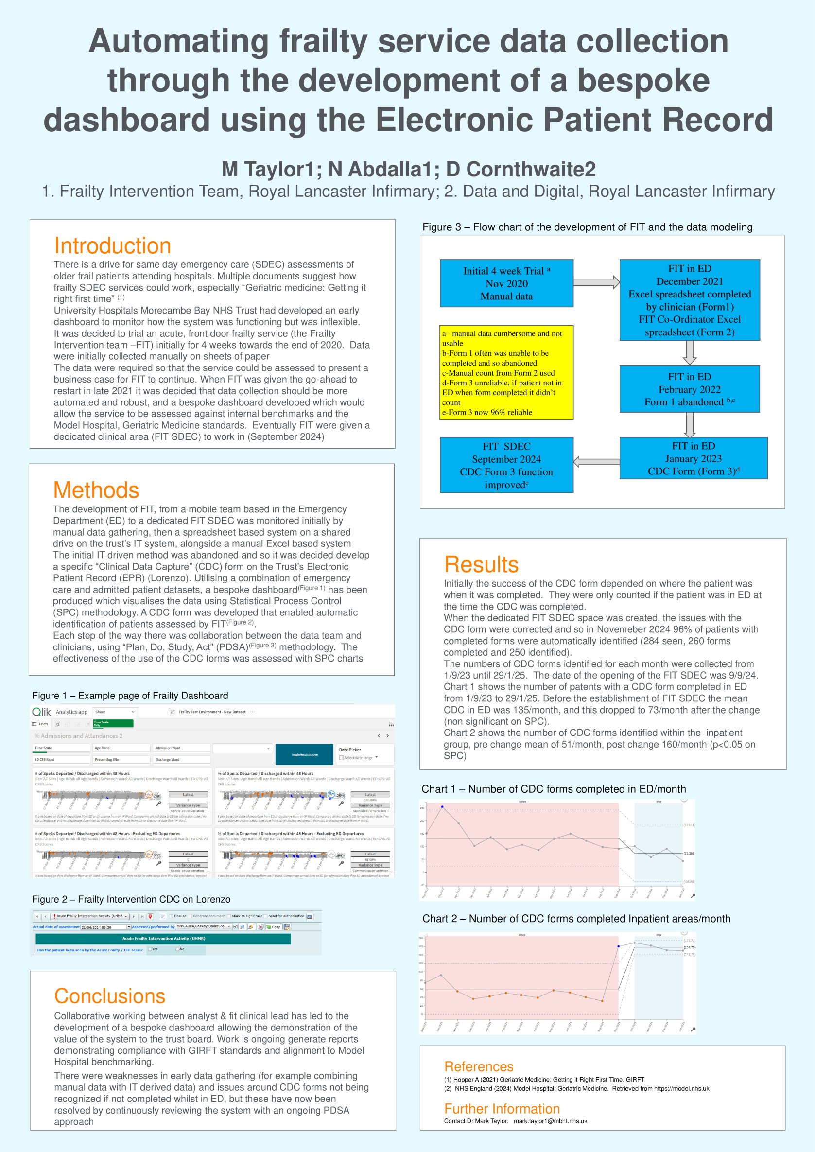 A trial of a mobile frailty SDEC, the Frailty Intervention Team (FIT) took place for 4 weeks in October 2020.. Data were collected manually but most of the presented data was indirect, such as length of stay of all older frail patients, rather than directly related to who FIT had seen. As FIT developed it was clear that data collection required automation. This was achieved through use of specific “Clinical Data Capture” (CDC) forms on the Trust’s Electronic Patient Record (EPR). Utilising a combination of emergency care and admitted patient datasets, a bespoke dashboard has been produced which visualises the data using Statistical Process Control methodology. A CDC form was developed that enabled identification of patients assessed by FIT.
