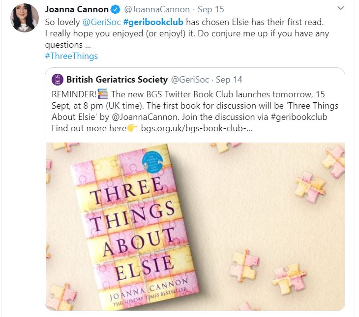We were delighted to host our first BGS Book Club on Twitter on September 15th, using the #geribookclub hashtag. Our aim was to provide a platform for people to come together and examine how themes relating to older adults and their healthcare, appear in literature. Our chosen first novel by Joanna Cannon, who worked as an NHS doctor before turning her hand to writing, centres on Flo, an older lady living in sheltered accommodation who we first meet when she is lying on the floor of her flat after a fall, and who is waiting for someone to find her. What follows is a story that moves around in time as Flo struggles to work out whether a mysterious issue from her past might be catching up with her. With help from some of the other residents and staff members at Cherry Tree House, and her great friend, Elsie, we are taken along on a story that spans a lifetime and raises questions about friendships, ageing, and how the past continues to impact the present. You can also see the discussion from our first meeting on Twitter by looking up #geribookclub.