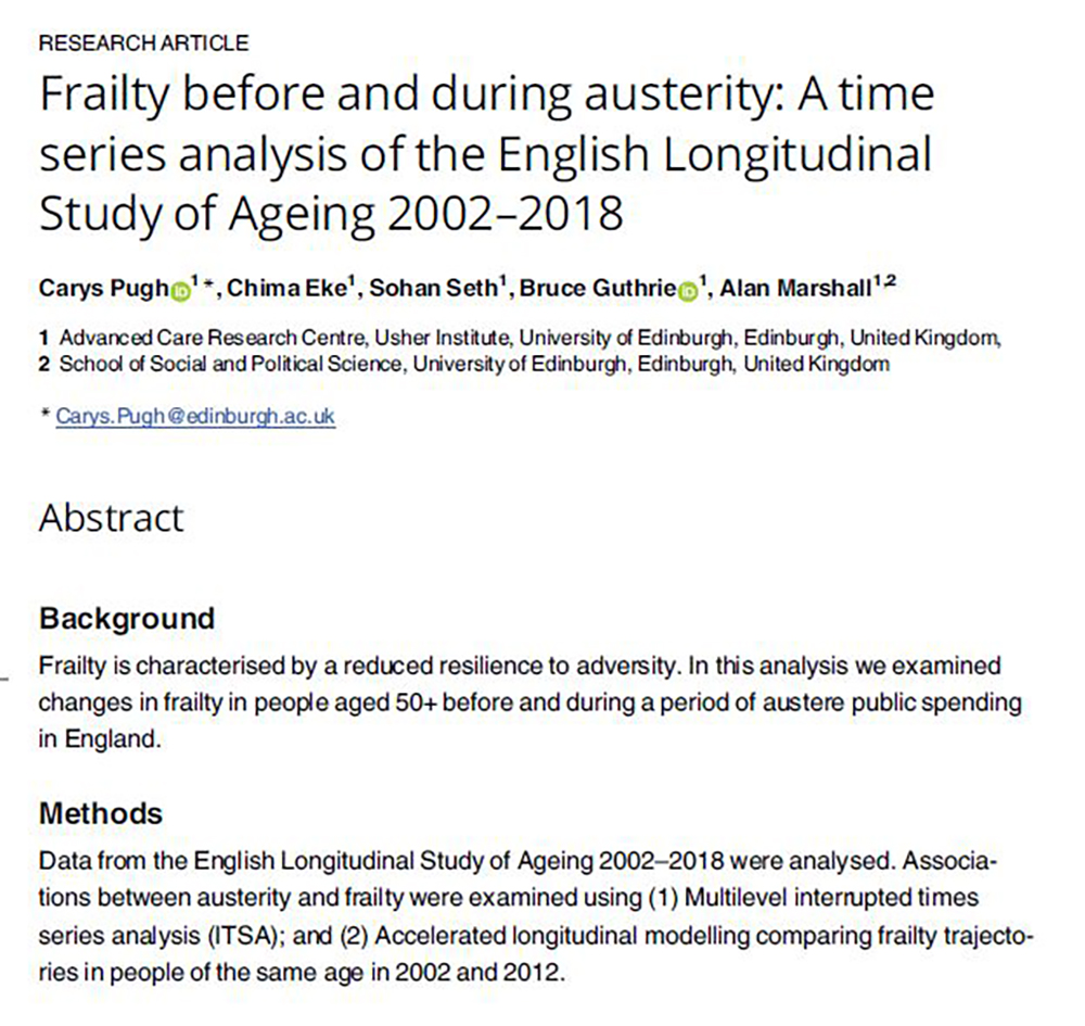 The British Geriatrics Society welcomes this new study published on 7 February in the journal PLOS ONE which looked at rates of frailty among older people in England between 2002 and 2018. It found that more older people developed frailty during the years of government austerity policies in the 2010s, with those from lower socioeconomic groups more likely to develop frailty.