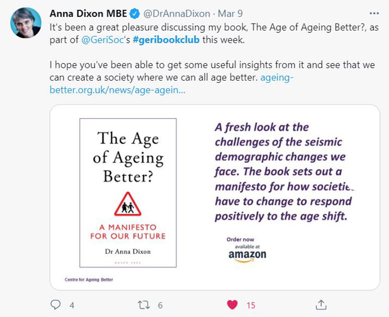 The BGS Twitter #GeriBookClub met once again on March 8th, to discuss ‘The Age of Ageing Better’, written by Anna Dixon MBE, who is the Chief Executive of the Centre for Ageing Better. We were delighted that Anna was able to join us for our discussion too, an opportunity we greatly value.