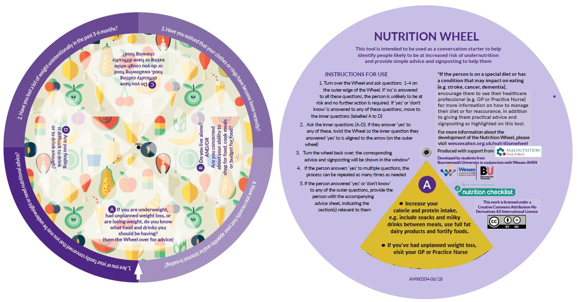 We have developed an interactive version called the ’Nutrition Wheel’ based in the Patients Association Nutrition Checklist. It is a conversation starter to help the wider community workforce to identify malnutrition and provide basic advice and signposting. This all started out as a prototype developed by an enthusiastic group of healthcare students from Bournemouth University in 2017. Further research followed to inform the design and usability and then to investigate the feasibility and acceptability of the Nutrition Wheel with volunteers in lunch clubs, activity and other community groups in Dorset, Hampshire and Hertfordshire.
