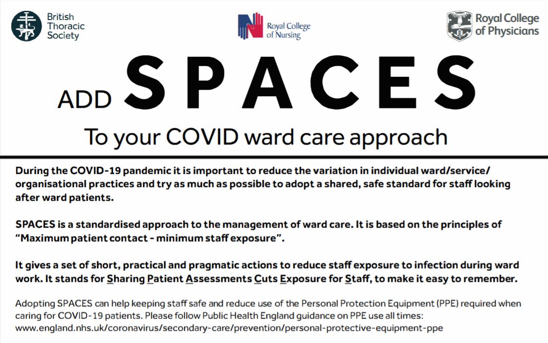 Staff safety remains an ongoing concern and we have tried to think about new ways of ward working, information on which is available on the BTS COVID-19 page. It is an alternative approach to ward care during this pandemic, concentrating on multi-professional working, maximising each staff-patient interaction and thereby reducing overall staff exposure to the virus and the reduced usage of already scarce PPE supplies. It can apply to any ward, not just in a respiratory department.