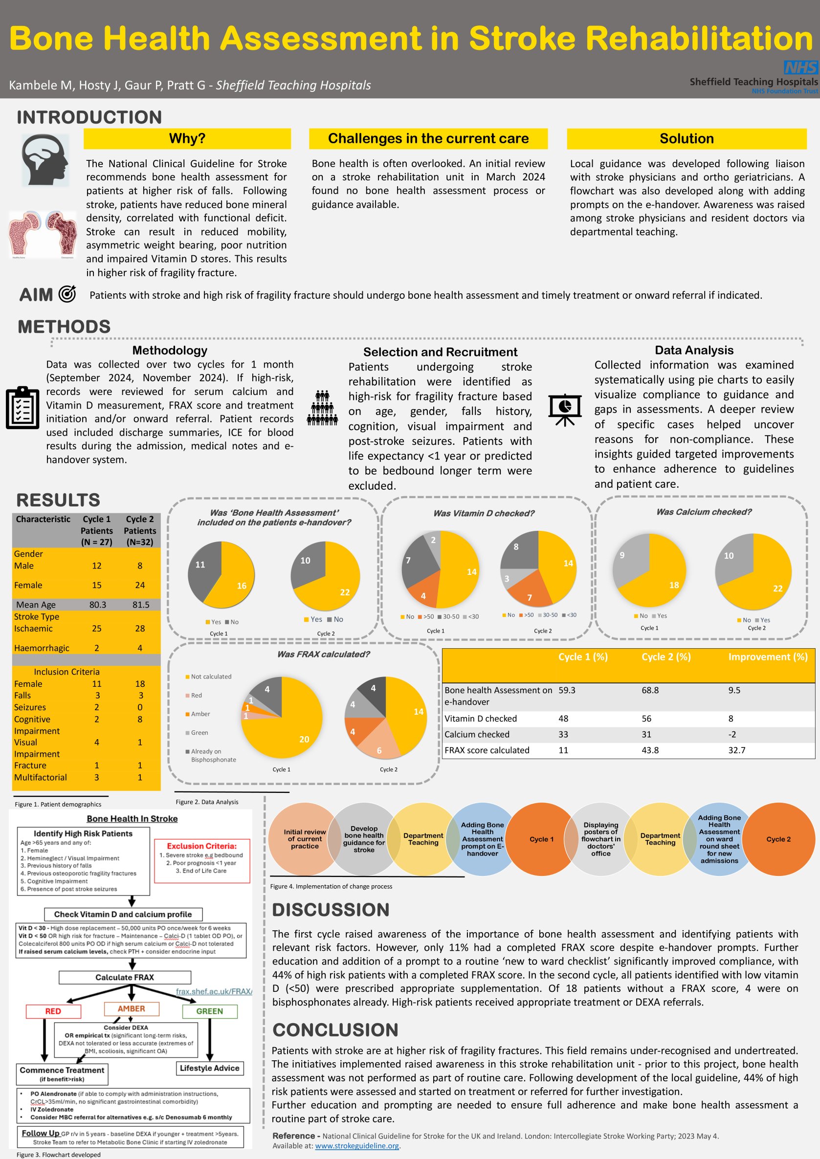 Conclusion: Patients with stroke are at higher risk of fragility fractures. Increased awareness and assessment in the rehabilitation setting are required. Further improvements include displaying posters of the treatment flowchart, induction education for rotating doctors and additional electronic record prompts to increase engagement.