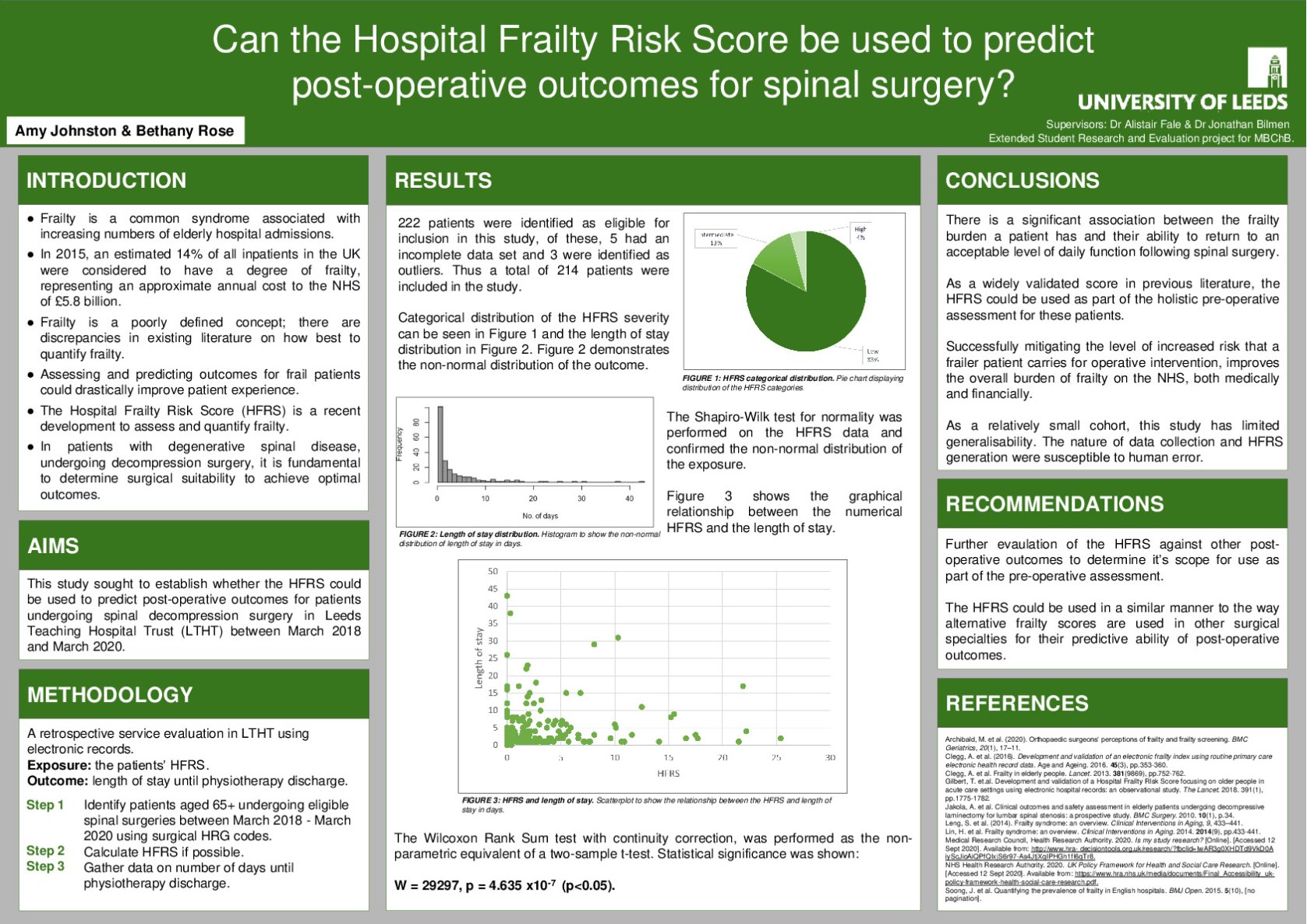 Frailty is a syndrome associated with increasing numbers of elderly hospital admissions and prolonged inpatient stays (Archibald et al, Geriatrics, 2020, 20, 17). In 2015, an estimated 14% of inpatients in the UK were considered to have a degree of frailty, representing an approximate annual cost to the NHS of £5.8 billion (Soong et al, BMJ Open, 2015, 5, e008456; Han et al, Age and Aging, 2019, 48, 665-671). Frailty is poorly defined; there are discrepancies in existing literature on how to best quantify frailty. It is recognised there is a higher risk of adverse outcomes in this vulnerable population due to lack of physiological reserve (Clegg et al, The Lancet, 2013, 381, 752-762). The Hospital Frailty Risk Score (HFRS) is a recent development to measure frailty and identify patients at risk (Gilbert et al, The Lancet, 2018, 391, 1775-1782). This study sought to establish whether the HFRS could be used in patients with degenerative spinal disease, undergoing decompression surgery, to predict post-operative outcomes.
