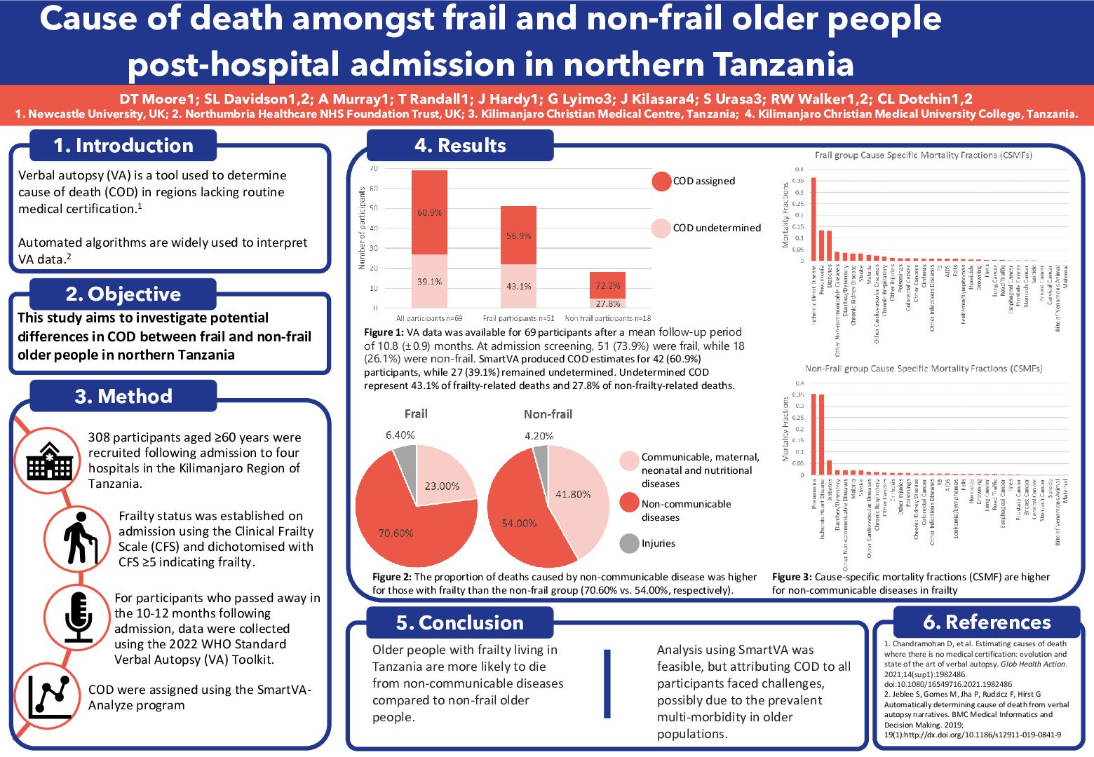 This work forms part of a longitudinal study investigating the clinical outcomes of 308 consecutive adults aged ≥60 years following admission to four hospitals in northern Tanzania. Frailty status was established on admission using the Clinical Frailty Scale (CFS) and dichotomised with CFS ≥5 indicating frailty. For participants who passed away in the 10-12 months following admission, VA data were collected through telephone interview using the 2022 World Health Organization (WHO) VA instrument. COD estimates were established using the SmartVA-Analyze program, implementing the Tariff 2.0 Method.