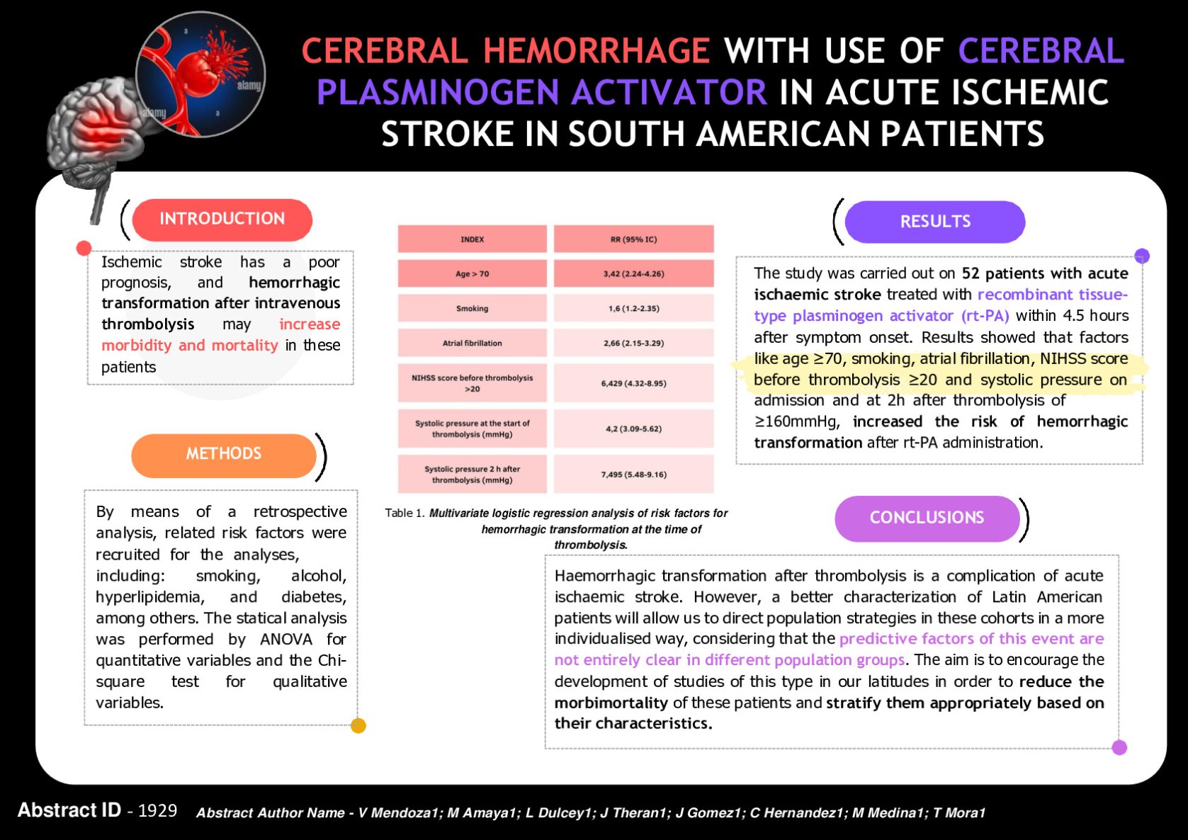 Introduction: Ischaemic stroke has a poor prognosis, and hemorrhagic transformation after intravenous thrombolysis may increase morbidity and mortality in these patients. Methods: By means of a retrospective analysis, related risk factors were recruited for the analyses, including: smoking, alcohol, hyperlipidemia, and diabetes, among others. The statistical analysis was performed by ANOVA for quantitative variables and the Chi-square test for qualitative variables. Results: The study was carried out on 52 patients with acute ischaemic stroke treated with recombinant tissue-type plasminogen activator (rt-PA) within 4.5 hours after symptom onset. Results showed that factors like age ≥70, smoking, atrial fibrillation, NIHSS score before thrombolysis ≥20 and systolic pressure on admission and at 2h after thrombolysis of ≥160mmHg, increased the risk of hemorrhagic transformation after rt-PA administration. Conclusions: Haemorrhagic transformation after thrombolysis is a complication of acute ischaemic stroke. However, a better characterization of Latin American patients will allow us to direct population strategies in these cohorts in a more individualised way, considering that the predictive factors of this event are not entirely clear in different population groups. The aim is to encourage the development of studies of this type in our latitudes in order to reduce the morbimortality of these patients and stratify them appropriately based on their characteristics.