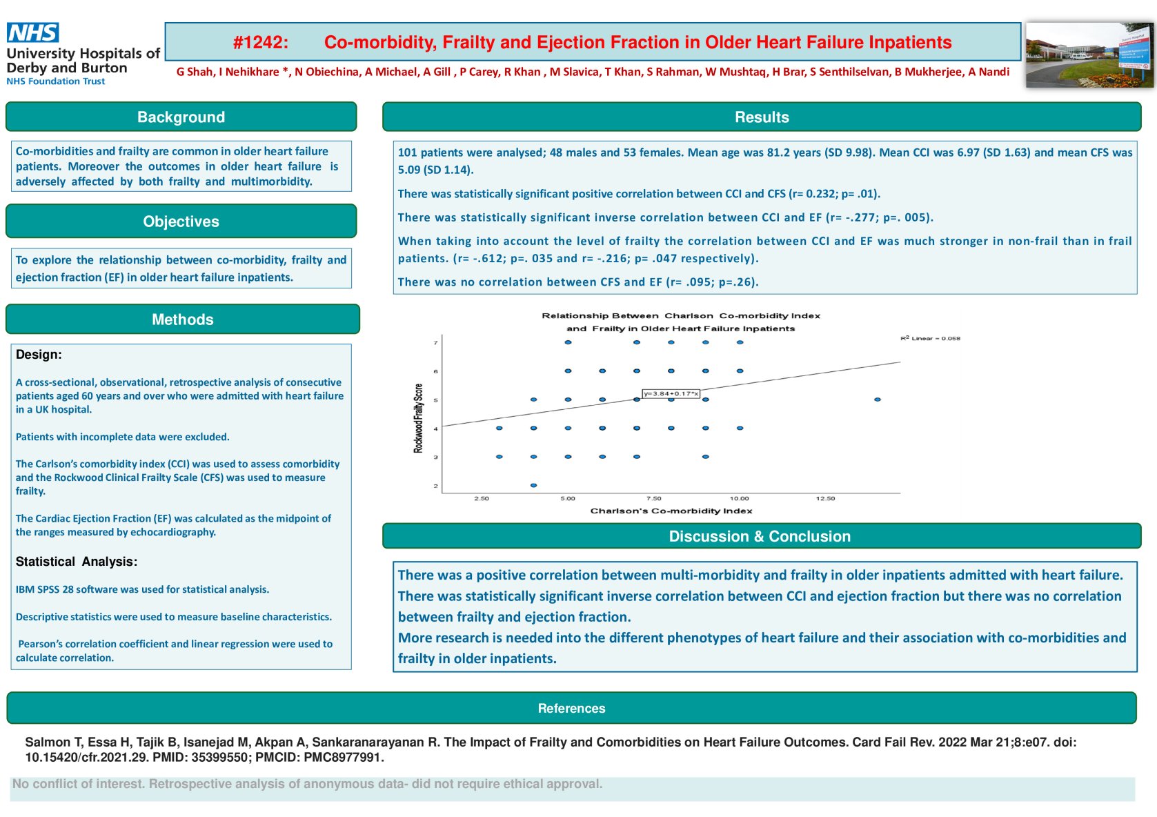 A cross-sectional, observational, retrospective analysis of consecutive patients aged 60 years and over who were admitted with heart failure in a UK hospital. Patients with incomplete data were excluded. Carlson’s comorbidity index (CCI) was used to compute comorbidity, and the Rockwood Clinical Frailty Scale (CFS) was used to measure frailty. The EF was calculated as the midpoint of the ranges measured by echocardiography. IBM SPSS 28 software was used for statistical analysis. Descriptive statistics were used to measure baseline characteristics, and Pearson’s correlation coefficient and linear regression were used to calculate the correlation.