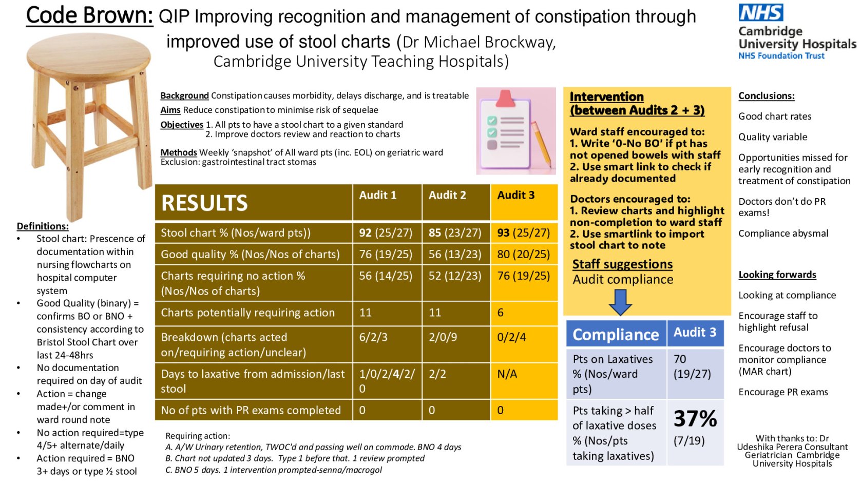 Results: Stool charts were available for 92% and 85% of ward patients for the first two audit rounds pre-intervention. Of these 76% and 56% were of good quality. Following intervention 93% of ward patients had a stool chart, with 80% of these of good quality. After excluding charts not requiring action, 11 charts, 11 charts and 6 charts respectively were left that possibly required action.