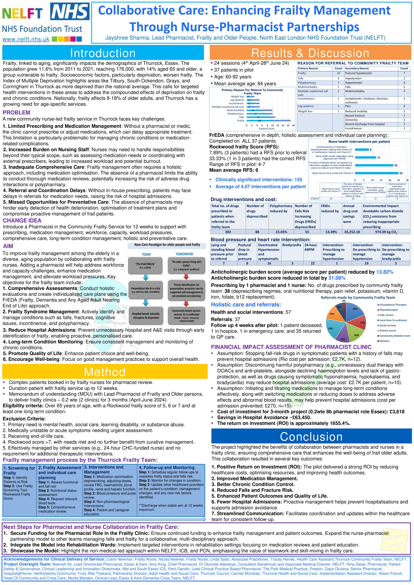 Method: A 12-week pilot involved patients aged 65+ undergoing joint reviews with a frailty nurse and pharmacist. Participants had a Rockwood Frailty Score of 5-7 and at least one long-term condition. The reviews encompassed an evaluation of physical observations, medication regimen, functional and fall risk assessment, nutritional status, fracture risk, and analysis of pertinent blood test results. The management phase focused on reviewing long-term chronic conditions, deprescribing, medication dose adjustments, and addressing health metrics such as postural hypotension, bradycardia, bone protection, and fall risk. Regular follow-ups ensured coordinated care between the nurse and pharmacist, focusing on patient-centred outcomes and patient safety.