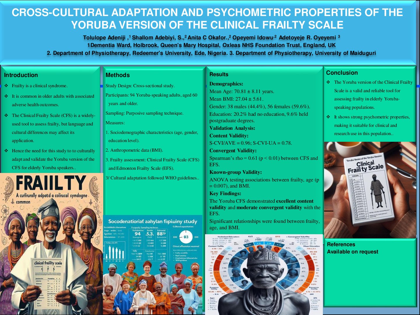 This cross-sectional study aimed to assess the socio-demographic, anthropometric, and patient characteristics of 94 Yoruba speakers aged 60 years and older, and to validate the Yoruba version of the Clinical Frailty Scale (CFS).