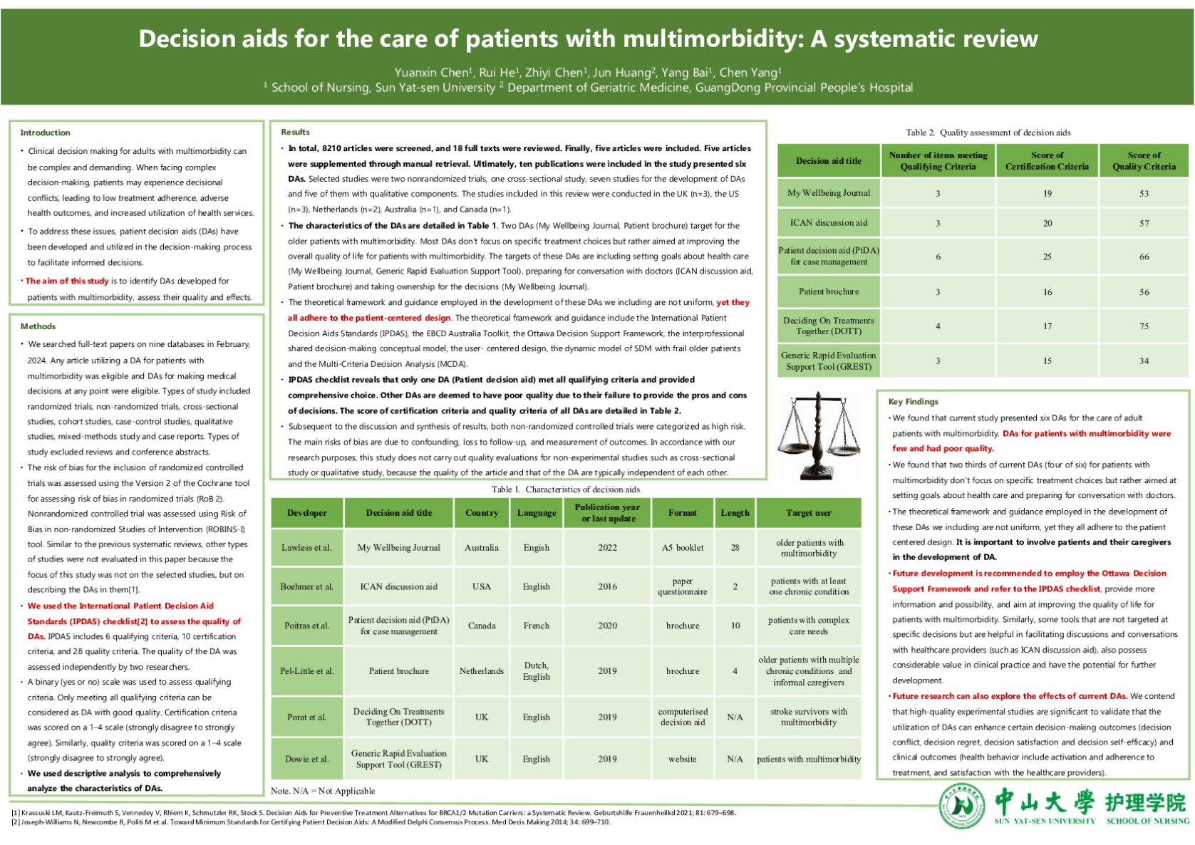 Results: In total, ten articles including six DAs were included. Two DAs targeted for the older patients with multimorbidity. Most DAs didn’t focus on specific treatment choices but rather aimed at improving the overall quality of life for patients with multimorbidity. The targets of these DAs are including setting goals about health care, preparing for conversation with doctors and taking ownership for the decisions. IPDAS checklist revealed that only one DA met all qualifying criteria and provided comprehensive choice. Three DAs were deemed to have poor quality due to their failure to provide the pros and cons of decisions. The quality of the remaining DAs was difficult to judge due to incomplete versions.
