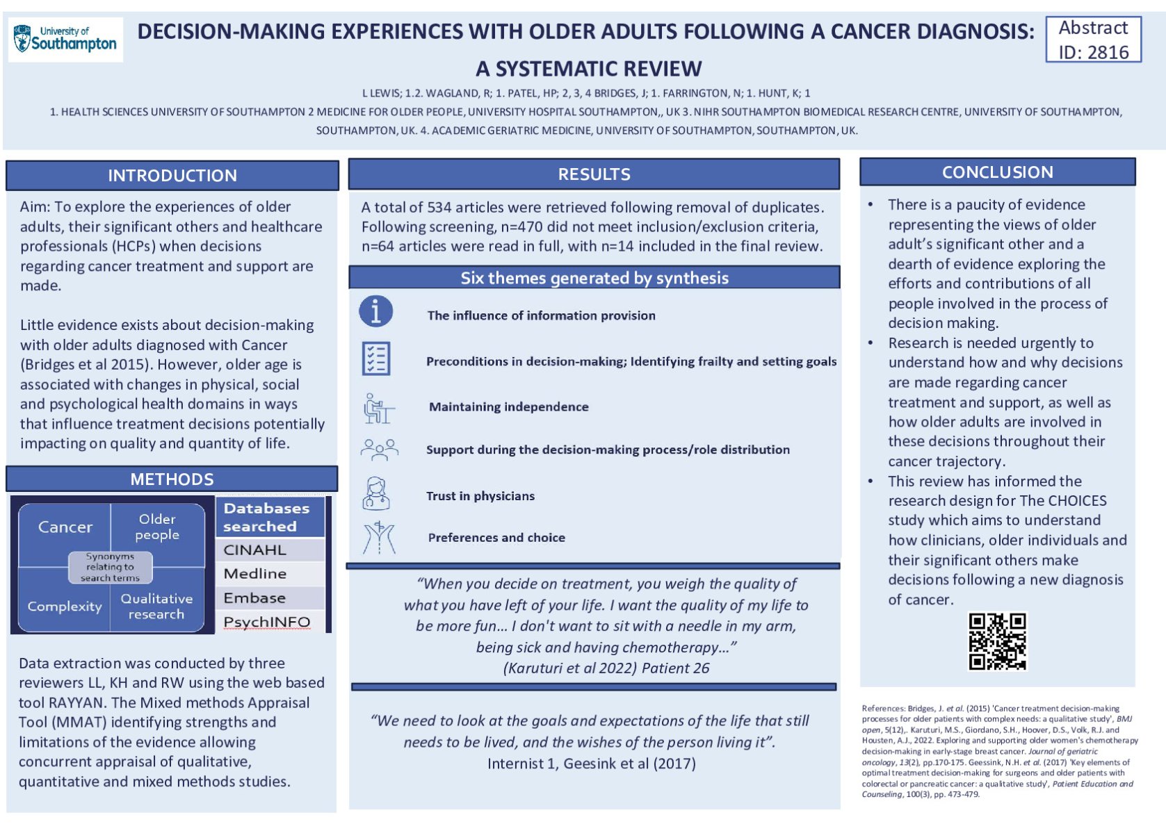 Little evidence exists about decision-making with older adults diagnosed with cancer (Bridges et al 2015). However, older age is associated with changes in physical, social, and psychological health domains in ways that influence treatment decisions potentially impacting on quality and quantity of life. We sought to explore the experiences of older adults, their significant others and healthcare professionals when decisions regarding cancer treatment and support are made.