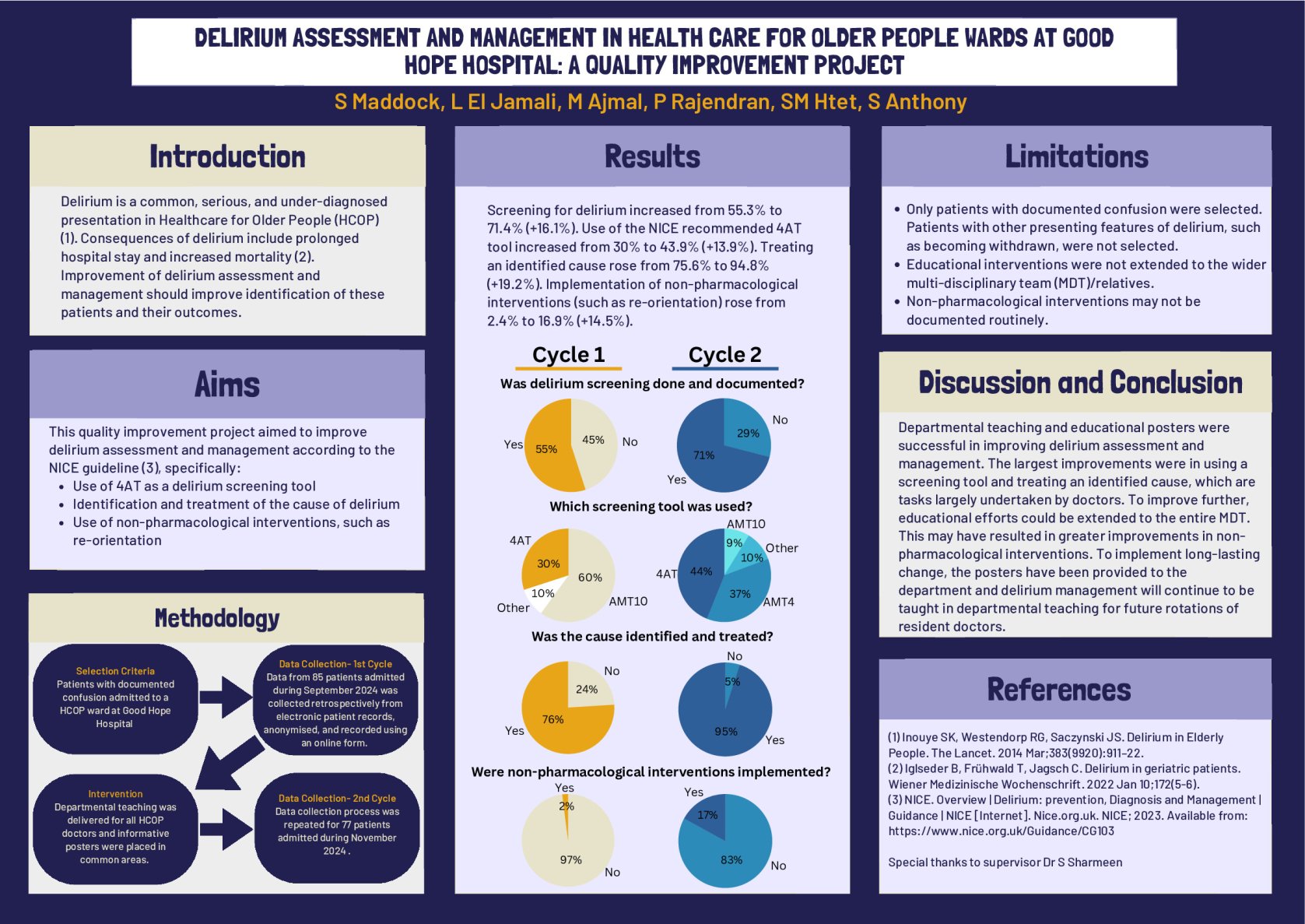 Patients with documented confusion were selected and delirium assessment/management was compared to current NICE Guidance. This included whether delirium screening was done, which screening tool was used, and how delirium was managed. Data was collected retrospectively from electronic patient records, anonymised, and recorded using an online form. Data from 85 randomly-selected patients admitted to HCOP wards in Good Hope Hospital during September 2024 was collected. Interventions of departmental teaching for all HCOP doctors and informative posters in common areas were implemented. Data collection was then repeated with 77 patients admitted during November 2024.