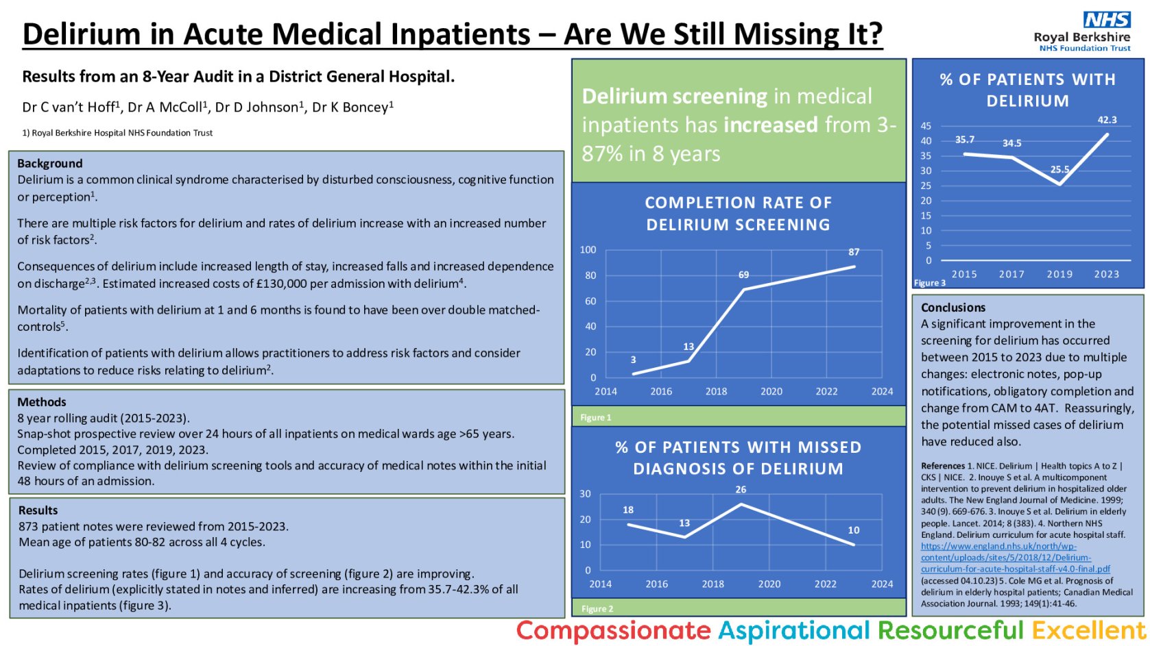 A total of 873 patient notes were reviewed between 2015–2023. The completion rate of screening for delirium increased to 87% in 2023 (2015/2017/2019=3%/13%/69%). Overall, the diagnosis of delirium that was explicitly stated in the notes (made via CAM/4AT or clinical assessment) similarly increased to 32% in 2023 (2015/2017/2019=10%/22%/12%). However, in the recent results a delirium diagnosis was potentially still missed in 10% of cases, though this similarly had improved from prior years (2015/2017/2019=18%/13%/26%). Overall, in hospital the number of patients >65 admitted under the care of medicine with delirium in the initial 48 hours has remained constant since 2015 between 30%-42%.