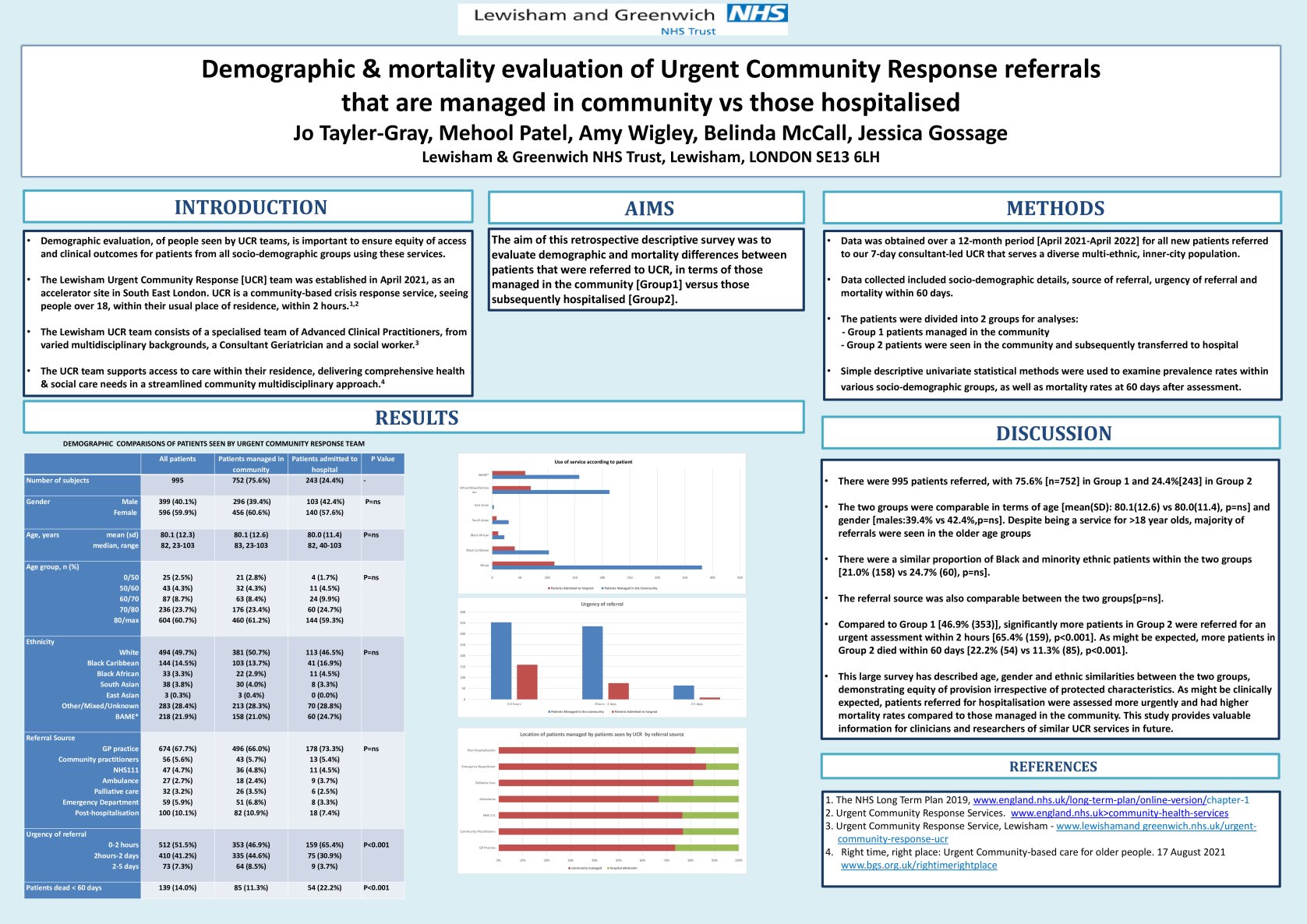 Demographic evaluation of urgent community response teams [UCR] is important to ensure equity of access and clinical outcomes for patients from all socio-demographic groups using such services. This retrospective descriptive study aimed to evaluate demographic and mortality differences between patients referred to UCR in terms of those managed in the community [Group1] versus those subsequently hospitalised [Group2].