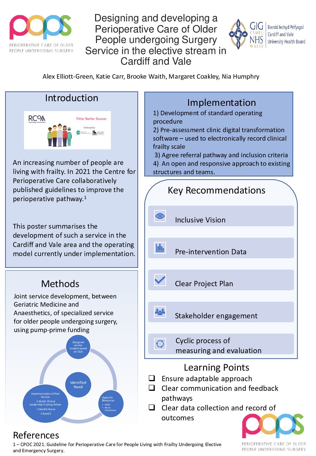 An increasing number of older people living with frailty are undergoing surgery. The Centre for Perioperative Care (CPOC) published guidelines in 2021 to improve the care of this patient group through the perioperative pathway. Whilst significant progress has been made in Cardiff and Vale in improving unscheduled surgical care for older people, there remains a dearth of services for patients undergoing elective procedures.
