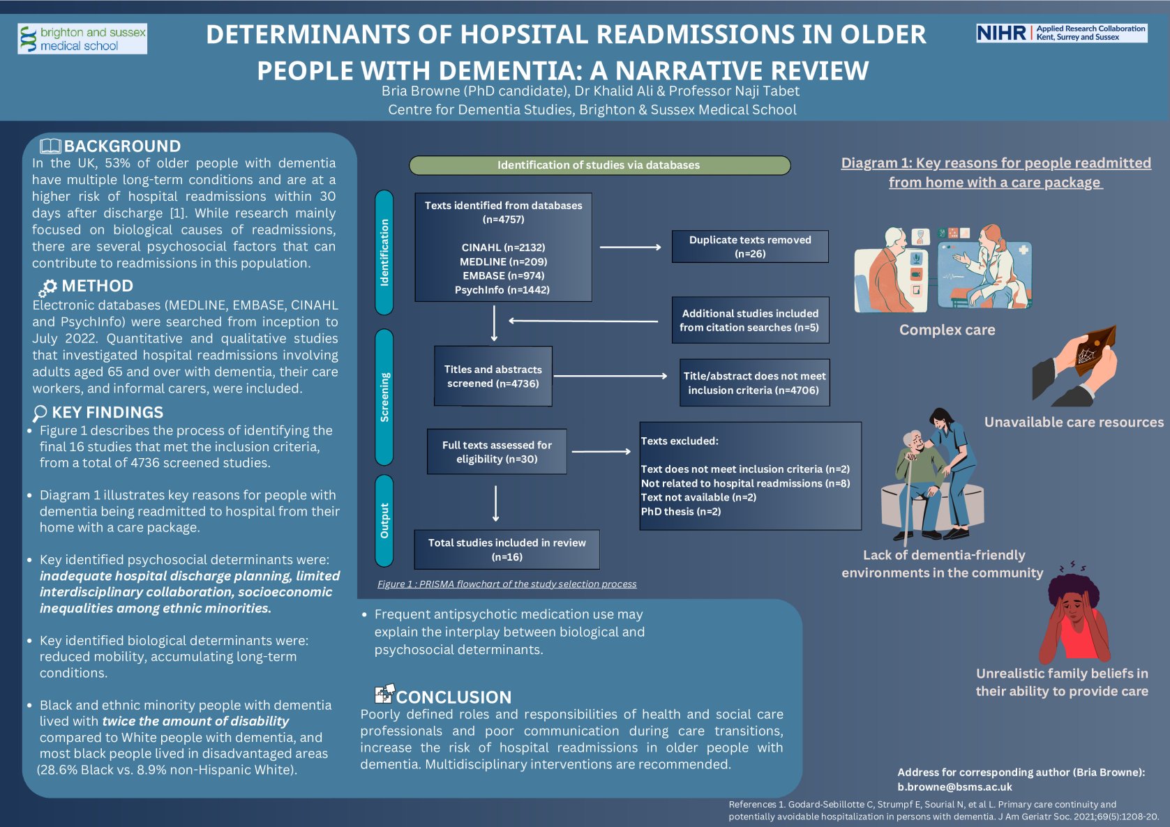 In the UK, fifty-three percent of hospitalised older people with dementia have multimorbidity, and are at an increased risk of hospital readmission within 30 days from discharge. Between 20-40% of these readmissions are preventable [1]. Current research focused on the biological causes of readmissions. However, older people with dementia have additional psychosocial factors increasing their risk of readmission. The aim of this scoping review was to identify psychosocial determinants within the context of known biological factors.