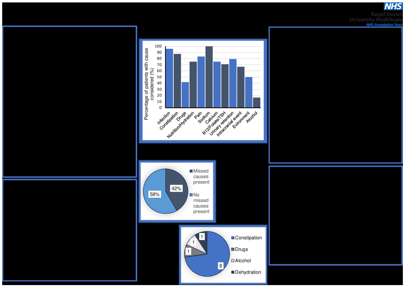 A local audit of our inpatient elderly-care ward population identified as developing a delirium (24 patients), showed that once a cause of delirium was identified (commonly infection), further investigations into alternate or additional causes (including constipation, nutrition/hydration, electrolyte abnormalities, urinary retention, medications, alcohol withdrawal) were often not considered. We identified at least 1 potential missed cause of delirium in 42% of patients audited.