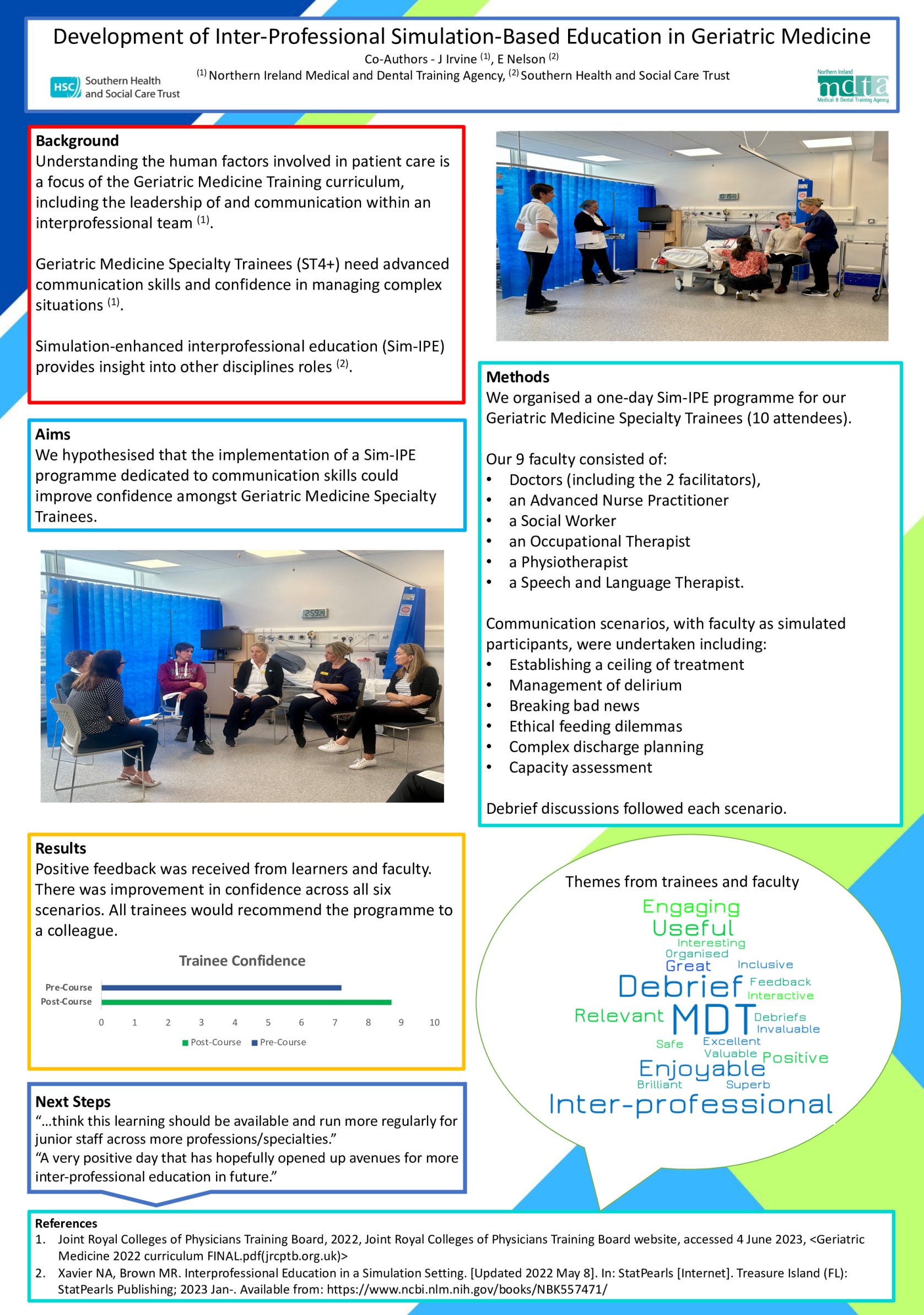 We organised a one-day Sim-IPE programme for our Geriatric Medicine ST4+. Faculty consisted of doctors, advanced nurse practitioner, social worker, occupational therapist, physiotherapist and speech and language therapist. Communication scenarios, with faculty as simulated participants, were undertaken including establishing a ceiling of treatment, management of delirium, breaking bad news, ethical feeding dilemmas, complex discharge planning and capacity assessment. Debrief discussions followed each scenario. Mixed-method evaluation was used with questionnaires collected from learners’ pre and post session in a 10-point Likert scale to compare confidence levels. Qualitative feedback was collected from learners and faculty.