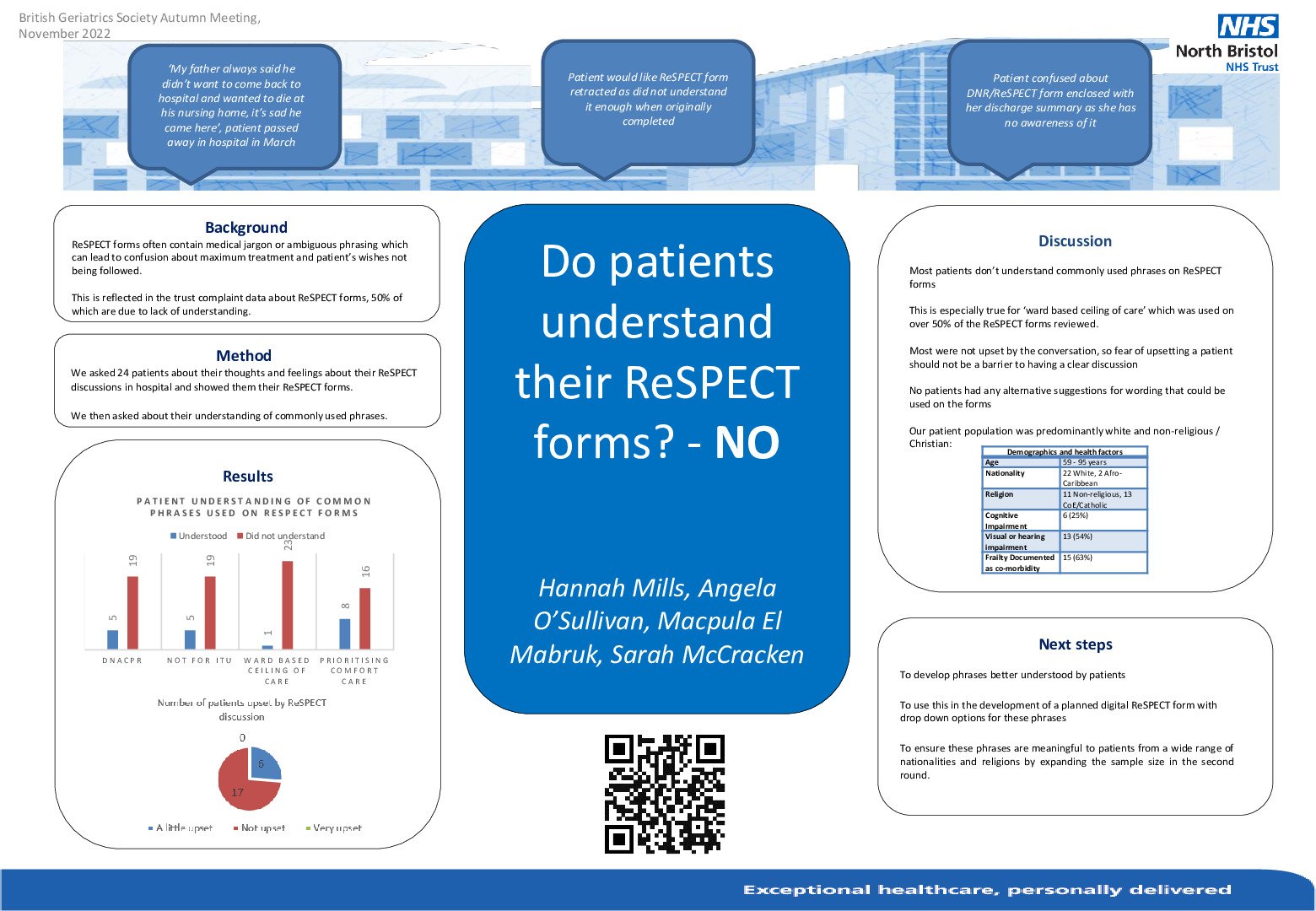 Background Hospital based Quality Improvement Project focusing on adapting language used on Recommended Summary Plan for Emergency Treatment and Care (ReSPECT) forms to improve patient understanding. Introduction ReSPECT forms have been used to document patient wishes and appropriate escalation of treatment in our hospital since 2019. There continues to be a lack of understanding of phrases used amongst both patients and healthcare professionals; the hospital receives regular complaints. This project explored patients’ perceptions of language used and their thoughts on the ReSPECT discussion, to better guide discussions and documentation. Methods A questionnaire collecting qualitative and quantitative data was performed with 24 patients aged between 59-95 years old with ReSPECT forms on a medical ward (Geriatrics/Endocrine). Results The phrases ‘DNACPR’ and ‘Not for ITU’ were understood by 5/24 patients (21%), ‘Ward based ceiling of care’ was understood by only 1/24 (4%) and ‘prioritising comfort care’ understood by 8/24 patients (34%). Only 6/24 (25%) of patients said they were a ‘little upset’ by their admission conversation about ReSPECT and no patients surveyed were ‘very upset’. Conclusions This first QI cycle found that overall, most patients did not understand the language commonly used on ReSPECT forms, particularly ‘ward-based ceiling of care’. The majority were not upset by the ReSPECT conversation, so a fear of upsetting the patient should not be a barrier to having a clear discussion. The next step in our QI work will be to explore phrases that are better understood by patients and then feedback findings so that we can develop a digital ReSPECT form with drop down options for phrases better understood by patients to describe ceilings of care.