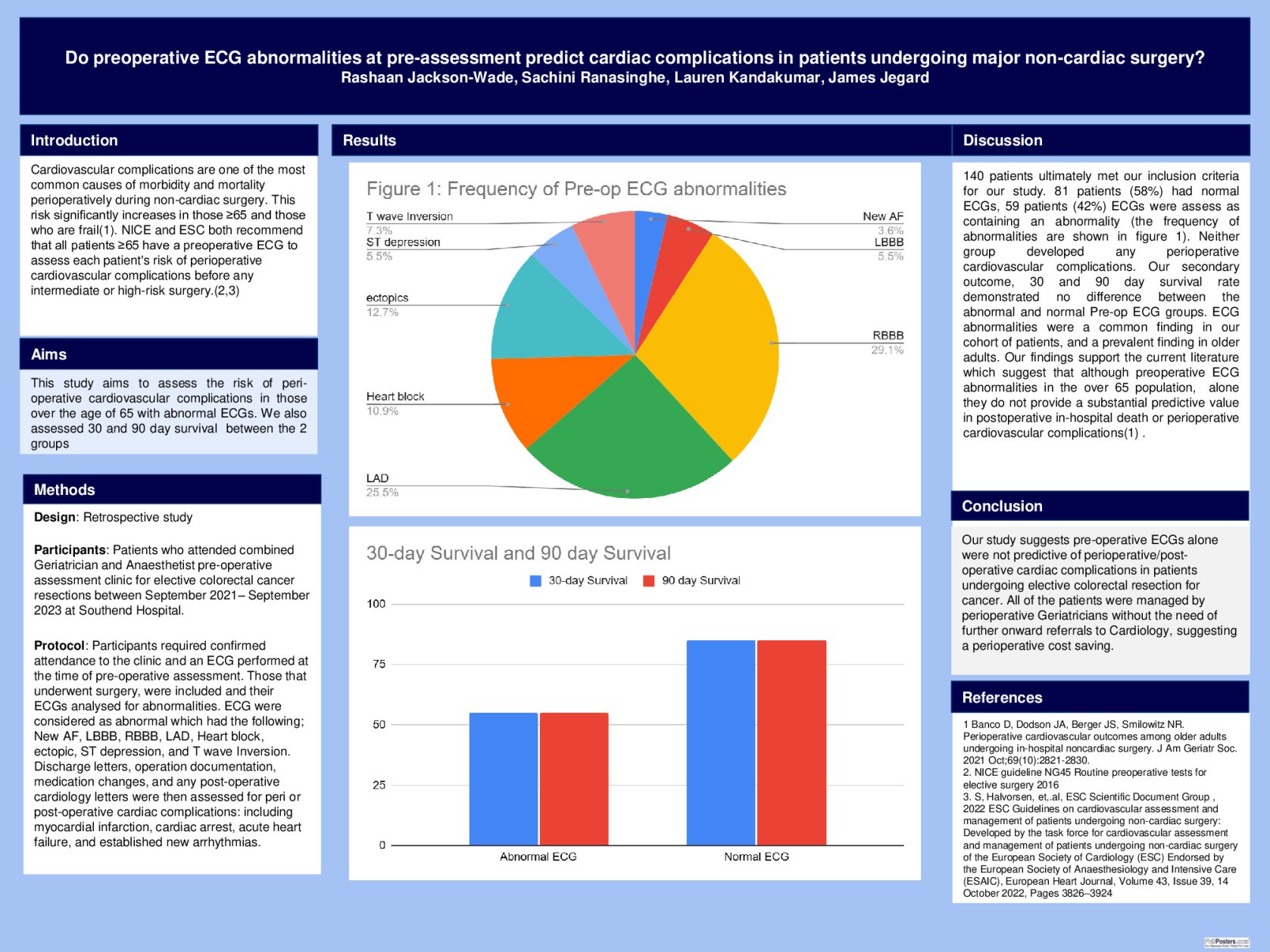 Background Cardiovascular complications are one of the most common causes of morbidity and mortality perioperatively during non-cardiac surgery. This risk is significantly increased in those ≥65 and those who are frail. NICE and ESC both recommend that all patients ≥65 have a pre-operative ECG to assess each patient's risk of perioperative cardiovascular complications before any intermediate or high-risk surgery. This study aims to assess the risk of perioperative cardiovascular complications in those ≥65 with abnormal ECGs. Methods We analysed data from patients attending our combined Geriatrician and Anaesthetist run pre-operative assessment clinic for elective colorectal cancer resections between 23/09/2021 - 11/09/2023. All patients were aged ≥65, those who then underwent surgery had their pre-operative ECGs assessed for abnormalities including; New AF, LBBB, RBBB, LAD, Heart block, ectopics, ST depression, and T wave Inversion. There were no patients with episodes of non-sustained VT or long QT intervals, two categories ordinarily considered higher risk for complications. The discharge letters, operation notes, and any post-operative cardiology letters were then assessed for any perioperative/post-operative cardiac complications including myocardial infarction, cardiac arrest, acute heart failure, and established new arrhythmias. Results 140 patients between 23/09/2021 and 11/09/2023 underwent elective colorectal resection. 56 of these patients had abnormal pre-operative ECGs (40%) with; New AF (2), LBBB (3), RBBB (16), LAD (15), Heart block (6), Ectopics (7), ST depression (3), and T-wave Inversion (4). On assessment, none of these patients had any perioperative or postoperative cardiac complications. Conclusion Our study suggests pre-operative ECGs alone were not predictive of perioperative/post-operative cardiac complications in patients undergoing elective colorectal resection for cancer. All of the patients were managed by perioperative Geriatricians without the need of further onward referrals to Cardiology, suggesting a perioperative cost saving.