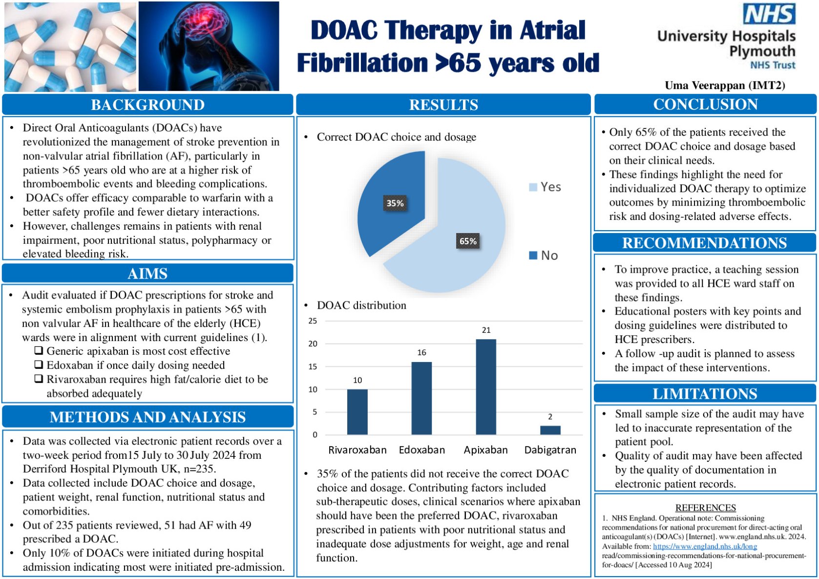 The DOAC distribution was Apixaban (n=21), Dabigatran (n=2), Rivaroxaban (n=10) and Edoxaban (n=16). Results showed only 65% received the correct DOAC and dosage based on their clinical needs. Contributing factors included sub-therapeutic doses, clinical scenarios where Apixaban should have been the preferred DOAC and inadequate dose adjustments for weight, age and renal function. These findings highlight the need for individualized DOAC therapy. To improve practice, a teaching session was provided on these findings and educational posters with key points and dosing guidelines have been distributed to healthcare of the elderly prescribers. A follow-up audit is planned to assess the impact of these interventions.