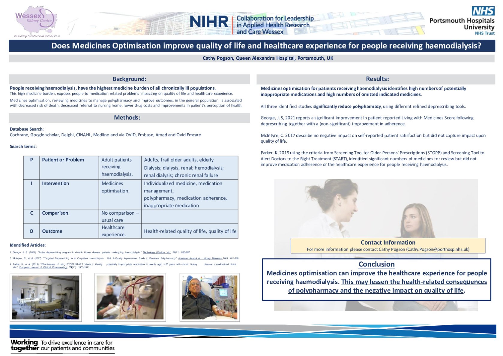 People receiving haemodialysis, have the highest medicine burden of all chronically ill populations. This high medicine burden, exposes people to medication related problems impacting on quality of life and healthcare experience. Medicines optimisation, reviewing medicines to manage polypharmacy and improve outcomes, in the general population, is associated with decreased risk of death, decreased referral to nursing home, lower drug costs and improvements in patient’s perception of health.
