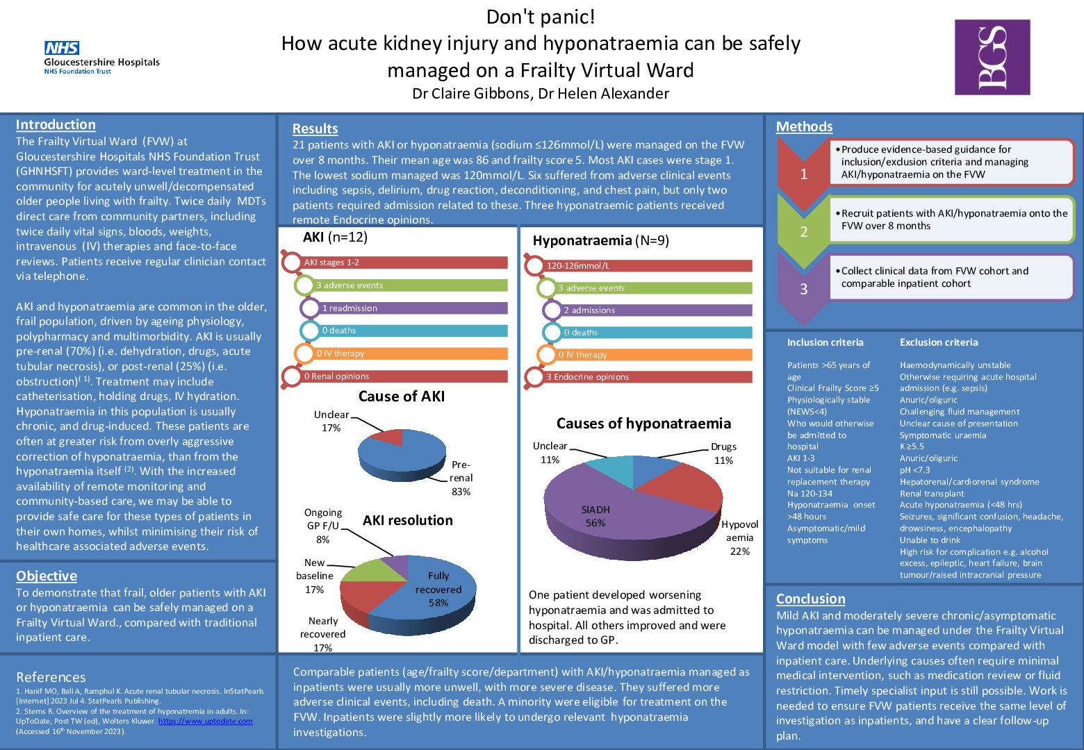 We produced guidance for managing patients with AKI/hyponatraemia on the Frailty Virtual Ward (FVW). We then collected data from patients treated for AKI (N=12) and hyponatraemia (sodium 126mmolL (N=9) and compared with a similar inpatient cohort (AKI N=14, hyponatraemia N=16). FVW patients received remote vital signs monitoring, telephone consultations and blood tests.