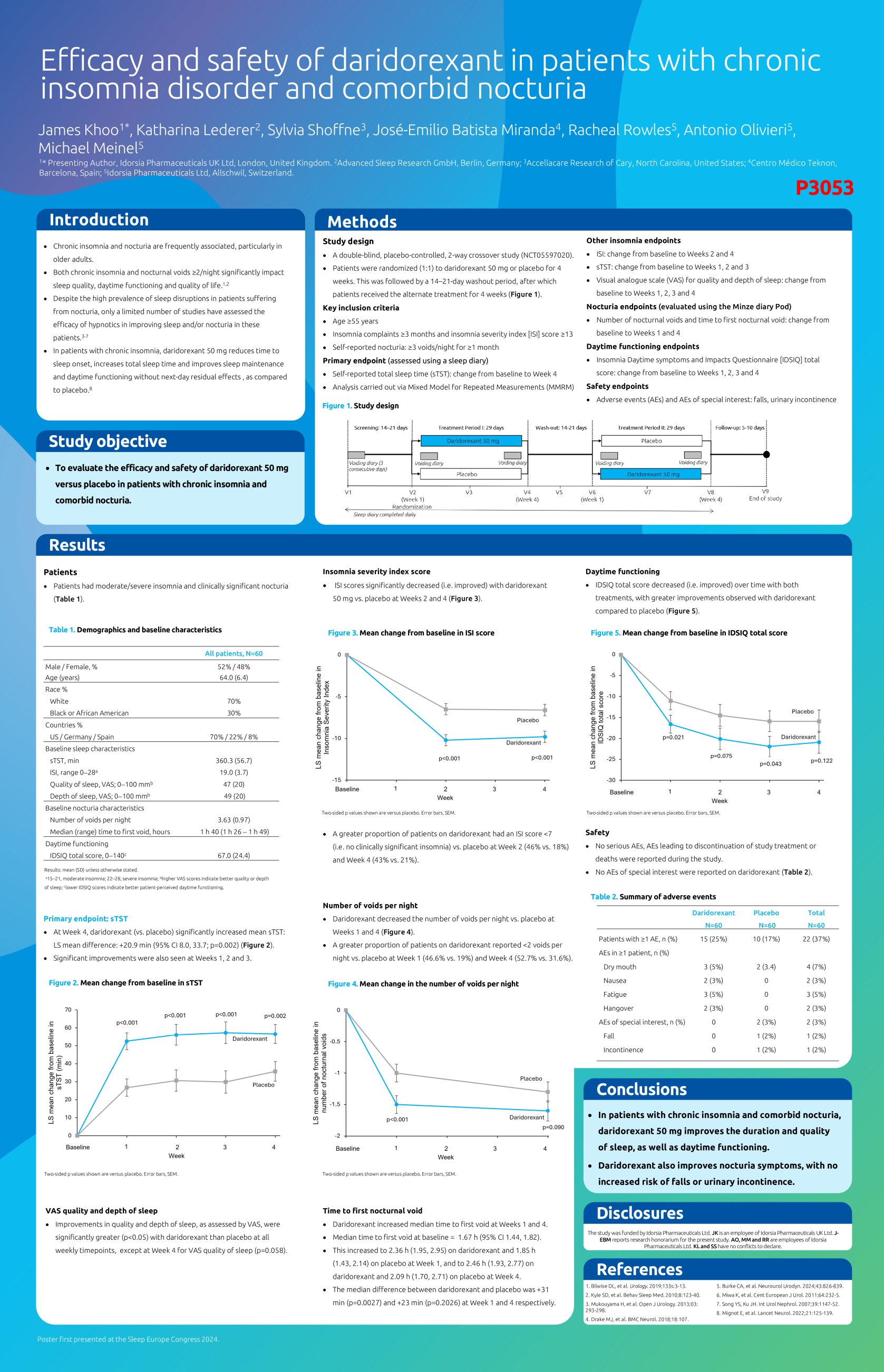 Introduction Chronic insomnia and nocturia are frequently associated, particularly in older adults impacting sleep quality, daytime functioning and quality of life. This study evaluated the efficacy and safety of daridorexant in patients with insomnia and comorbid nocturia. Methods This double-blind, placebo-controlled, two-way cross-over study randomised 60 patients aged ≥55 years with chronic insomnia and self-reported nocturia to 4-weeks nightly treatment of daridorexant 50 mg or placebo. This was followed by a 14–21-day washout period, after which patients received the alternate 4-week treatment. The primary endpoint was change from baseline to Week 4 in self-reported total sleep time (sTST). Other insomnia endpoints included change from baseline in ISI score, sTST, depth of sleep and daytime functioning (Insomnia Daytime symptoms and Impacts Questionnaire [IDSIQ] total score. Nocturia endpoints, evaluated using the Minze diary Pod, included change from baseline in number and time to first nocturnal void. Safety endpoints included adverse events (AEs) and AEs of special interest (AESI: falls, urinary incontinence). Results Daridorexant (vs. placebo) significantly increased mean sTST (56.6 vs. 35.7 mins; p=0.002) at Week 4; significant improvements were seen from Week 1. Daridorexant (vs. placebo) significantly (p<.05) decreased isi scores (weeks 2, 4) and significantly (p<0.05) improved depth of sleep 1-4) IDSIQ total score 1, 3). daridorexant (vs. placebo) reduced the number nocturnal voids (week 1: -1.5 vs. -1.0, p<0.001; week 4: -1.6 -1.3, p="0.2026)." increased median time to first void (difference placebo, +31 mins, +23 no serious aes />/AEs leading to discontinuation were reported in the study. No AESIs were reported during daridorexant administration. Conclusion In patients with insomnia and comorbid nocturia, daridorexant improves sleep, daytime functioning and nocturia symptoms, with no increased risk of falls or urinary incontinence. Funding: Idorsia Pharmaceuticals Ltd