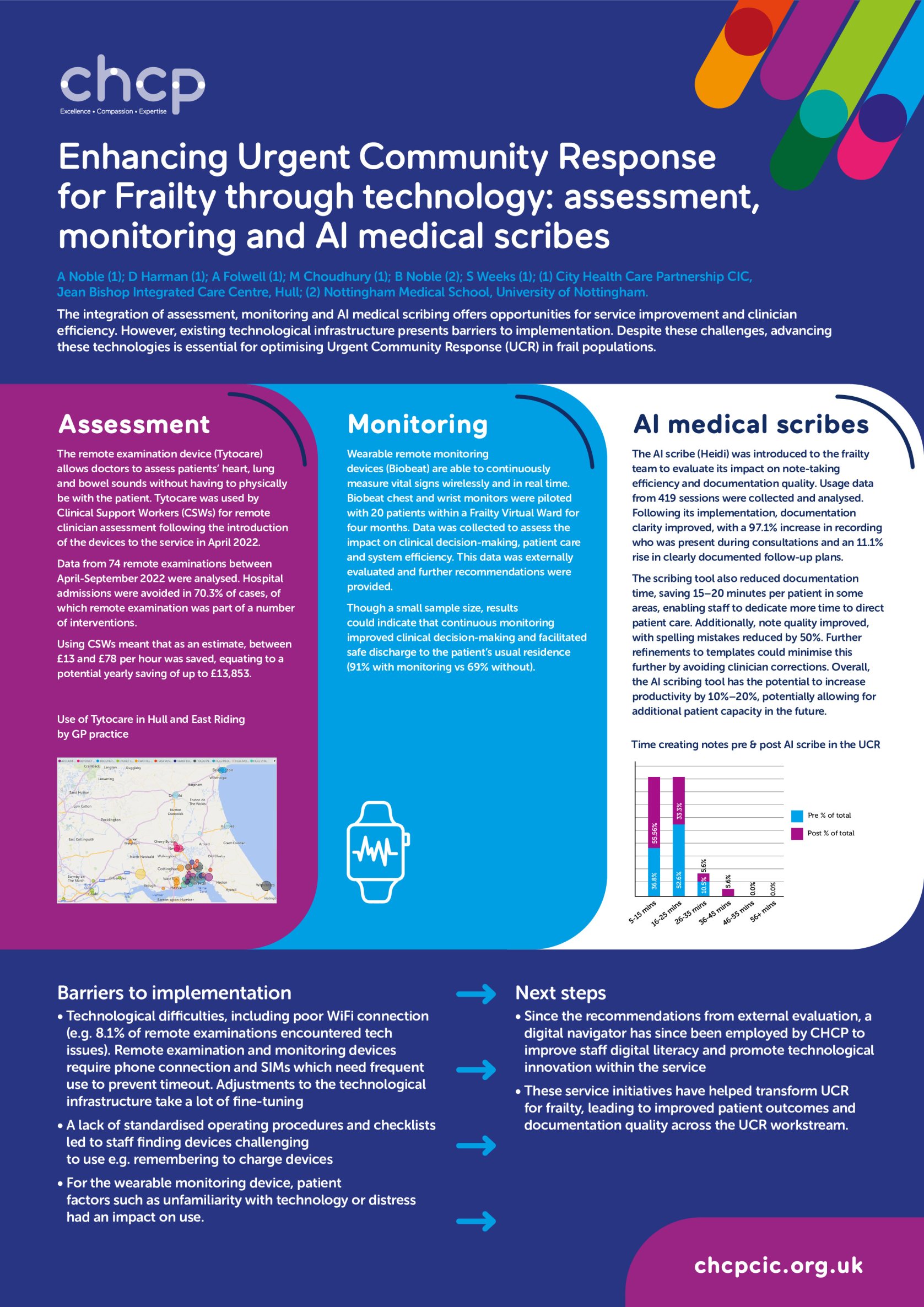 Urgent Community Response (UCR) teams need innovative solutions to deliver timely and effective care to frail older adults. This project explores the combined impact of remote assessment, continuous monitoring, and AI scribes to enhance UCR service delivery, aiming to improve patient care, staff efficiency, and resource utilisation.