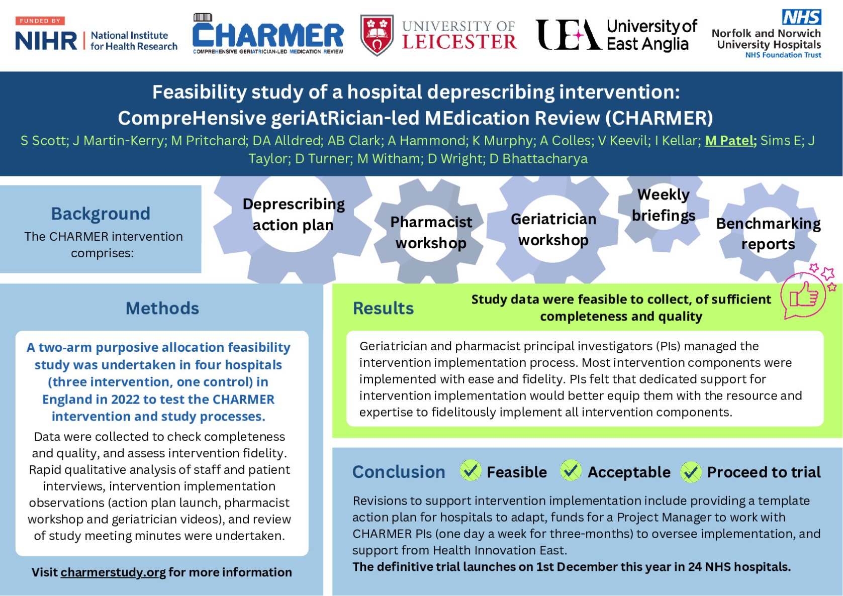 CompreHensive geriAtRician-led MEdication Review (CHARMER) is a behaviour change intervention to support geriatricians and pharmacists to proactively deprescribe inappropriate medicines with older adults in hospital. The intervention comprises: formulating a deprescribing action plan, workshops, benchmarking reports and weekly briefings between geriatricians and pharmacists. We assessed feasibility and acceptability of the CHARMER intervention and study processes.