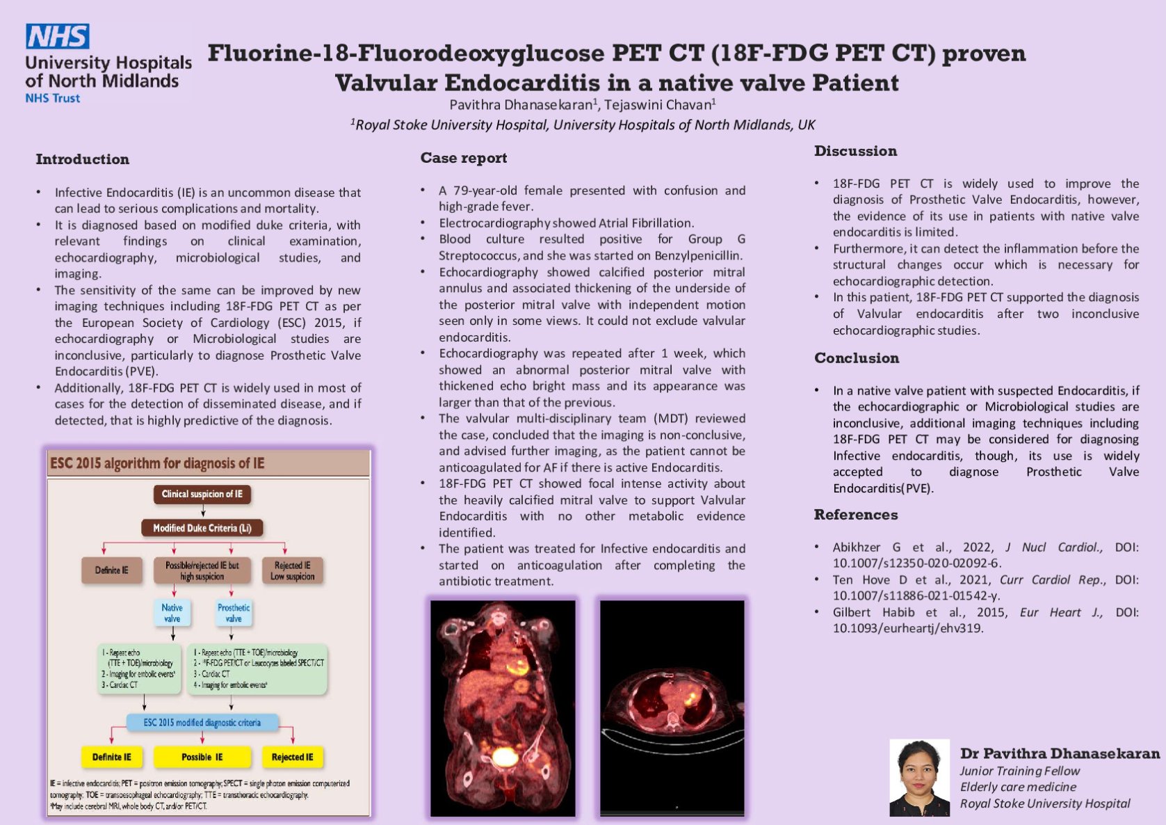 A 79-year-old female presented with confusion and high-grade fever. Electrocardiography showed Atrial Fibrillation (AF). Blood culture resulted positive for Group G Streptococcus, and she was started on Benzylpenicillin. Echocardiography showed old calcified posterior mitral annulus and associated thickening of the underside of the posterior mitral valve with independent motion seen only in some views. It could not exclude valvular endocarditis. Echocardiography was repeated after 1 week, which showed an abnormal posterior mitral valve with thickened echo bright mass and its appearance was larger than that of the previous study. The valvular multi-disciplinary team (MDT) reviewed the case, concluded that the imaging is non-conclusive, and advised further imaging, as the patient cannot be anticoagulated for AF if there is active Endocarditis. 18F-FDG PET CT showed focal intense activity about the heavily calcified mitral valve to support Valvular Endocarditis with no other metabolic evidence identified. The patient was treated for native valve endocarditis and started on anticoagulation after completing the antibiotic treatment.