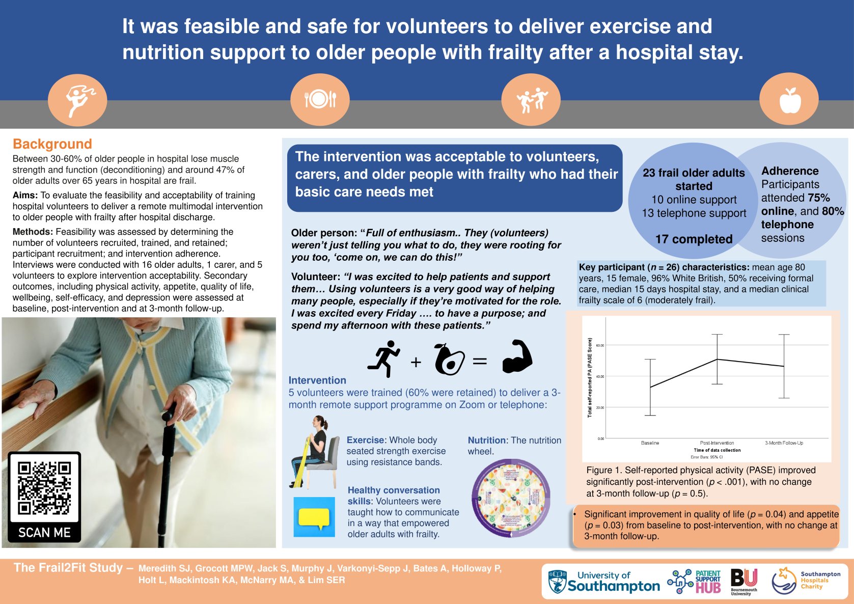 Volunteers were trained to deliver a 3-month, multimodal intervention to frail (Clinical Frailty Status ≥5) adults ≥65 years after hospital discharge, using telephone, or online support. Feasibility was assessed by determining the number of volunteers recruited, trained, and retained; participant recruitment; and intervention adherence. Interviews were conducted with 16 older adults, 1 carer, and 5 volunteers to explore intervention acceptability. Secondary outcomes included physical function, appetite, well-being, quality of life, anxiety and depression, self-efficacy, and PA. Outcomes were measured and compared at baseline, post-intervention, and follow-up (3-months). Interviews were transcribed verbatim and analysed using thematic analysis.