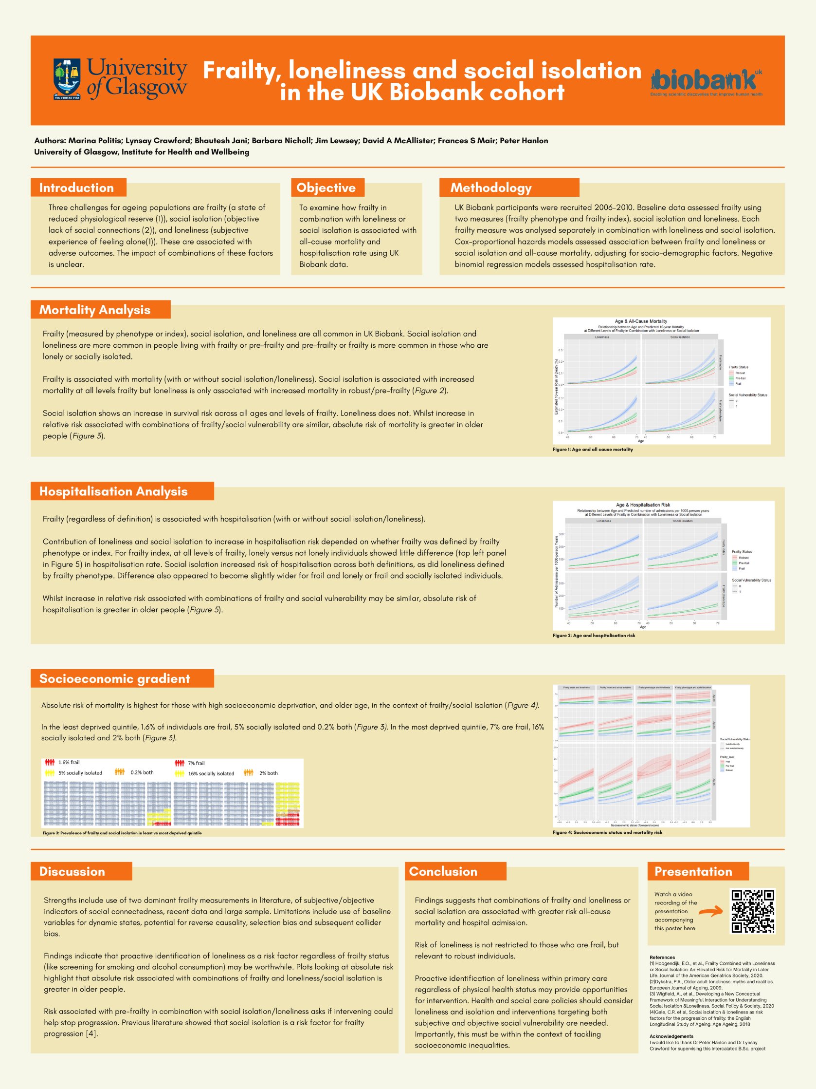 Background : Three challenges for ageing populations are frailty (a state of reduced physiological reserve), social isolation (objective lack of social connections), and loneliness (subjective experience of feeling alone). These are associated with adverse outcomes. This study aims to examine how frailty in combination with loneliness or social isolation is associated with all-cause mortality and hospitalisation rate using data from UK Biobank, a large population-based research cohort. Methods: 502,456 UK Biobank participants were recruited 2006-2010. Baseline data assessed frailty (via two measures: Fried frailty phenotype, Rockwood frailty index), social isolation, and loneliness. Adjusted cox-proportional hazards models assessed association between frailty in combination with loneliness or social isolation and all-cause mortality. Negative binomial regression models assessed hospitalisation rate. Findings: Frailty, social isolation, and loneliness are common in UK Biobank (frail as per frailty phenotype 3.38%, frail as per frailty index 4.68%, social isolation 9.04%, loneliness 4.75%). Social isolation/loneliness were more common in frailty/pre-frailty. Frailty is associated with increased mortality regardless of social isolation/loneliness. Hazard ratios for frailty (frailty phenotype) were 3.38 (3.11-3.67) with social isolation and 2.89 (2.75-3.05) without social isolation, 2.94 (2.64-3.27) with loneliness and 2.9 (2.76-3.04) without loneliness. Social isolation was associated with increased mortality at all levels of frailty; loneliness only in robust/pre-frail. Frailty was also associated with hospitalisation regardless of social isolation/loneliness. Incidence rate ratios for frailty (frailty phenotype) were 3.93 (3.66-4.23) with social isolation and 3.75 (3.6-3.9) without social isolation, 4.42 (4.04-4.83) with loneliness and 3.69 (3.55-3.83) without loneliness. At all levels frailty, social isolation/loneliness are associated with increased hospitalisation Results were similar using the frailty index definition. Conclusion: Social isolation is relevant at all levels frailty. Risk of loneliness is more pronounced in those who are robust or pre-frail. Proactive identification of loneliness regardless of physical health status may provide opportunities for intervention.