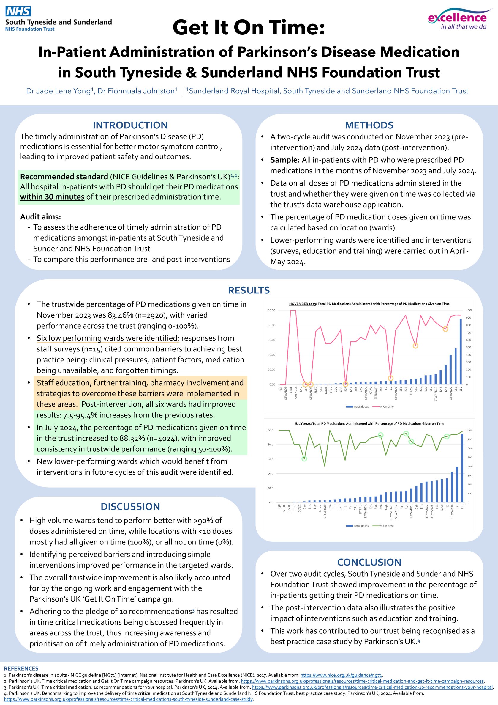 The timely administration of Parkinson’s Disease (PD) medications is essential for better motor symptom control, leading to improved patient outcomes. The NICE Guidelines and Parkinson’s UK recommend all hospital in-patients with PD should get their PD medications on time – within 30 minutes of their prescribed administration time. This audit aimed to assess the adherence of timely administration of PD medications amongst in-patients at South Tyneside and Sunderland NHS Foundation Trust, and to compare this pre- and post-interventions.