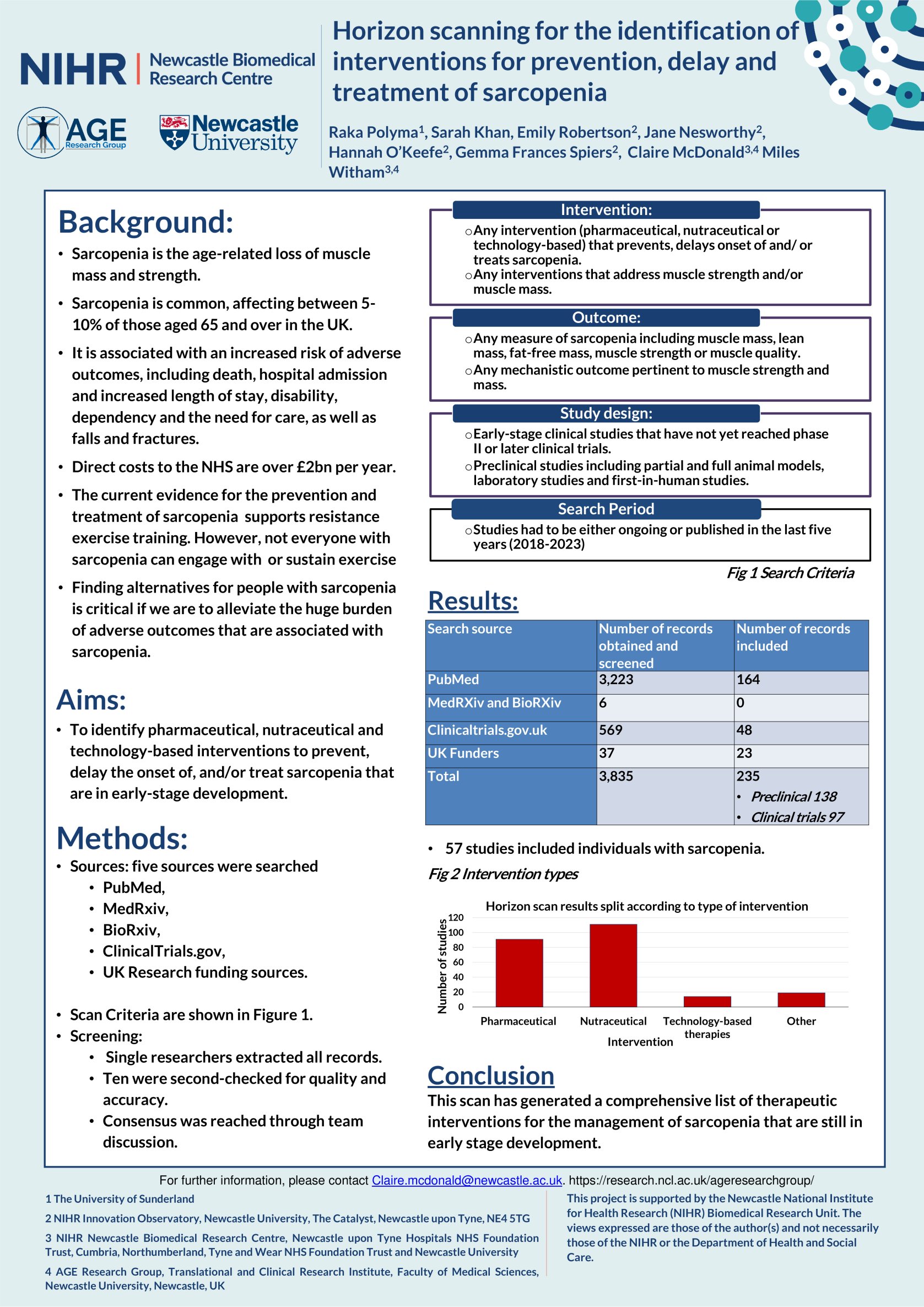 Background Sarcopenia is the age-related loss of muscle strength and mass. It affects 10% to 27% of individuals aged over 60 and increases the risk of falls, hospital admissions, and early mortality. It costs the UK around £2.5 billion annually in healthcare. Currently, no approved pharmacological treatments exist—this horizon scan aimed to identify early-stage trials testing potential interventions to prevent, delay, or treat sarcopenia. Methods Five databases were searched: PubMed, MedRxiv, BioRxiv, ClinicalTrials.gov, and UK Research Funding Successes. We included studies reporting pharmaceutical, nutraceutical, or technology-based interventions for preventing, delaying, or treating sarcopenia, as well as those targeting muscle strength or mass. We focused on early-stage preclinical studies, including animal models, laboratory studies, and first-in-human trials, published or ongoing within the last five years (2018-2023). "Early stage" refers to interventions not yet in Phase II or advanced trials. Records were screened by individual researchers, with team discussions held for uncertain cases. Ten per cent of records were also double-checked for quality and accuracy. Results The search yielded 3,835 publications. After screening, 235 met the inclusion criteria, of which 111 focused on nutraceuticals, 91 centred on licensed pharmaceuticals, and 14 examined technology-based therapies. Out of the 235 records, 138 were animal studies, with all but two being rodent-based. Ninety-seven studies were clinical trials. The human studies varied in size, with populations ranging from 6 to 630 participants. Fifty-one of these studies included individuals with sarcopenia. Other populations studied comprised healthy older adults, patients at risk of developing sarcopenia, cirrhotic and hemodialysis patients, osteoporotic women, and malnourished or sedentary individuals. Conclusions This horizon scan has generated a comprehensive list of potential interventions for sarcopenia and established a robust pipeline for clinical trials. Utilising a reliable intervention selection tool will aid in selecting the most promising interventions for testing.